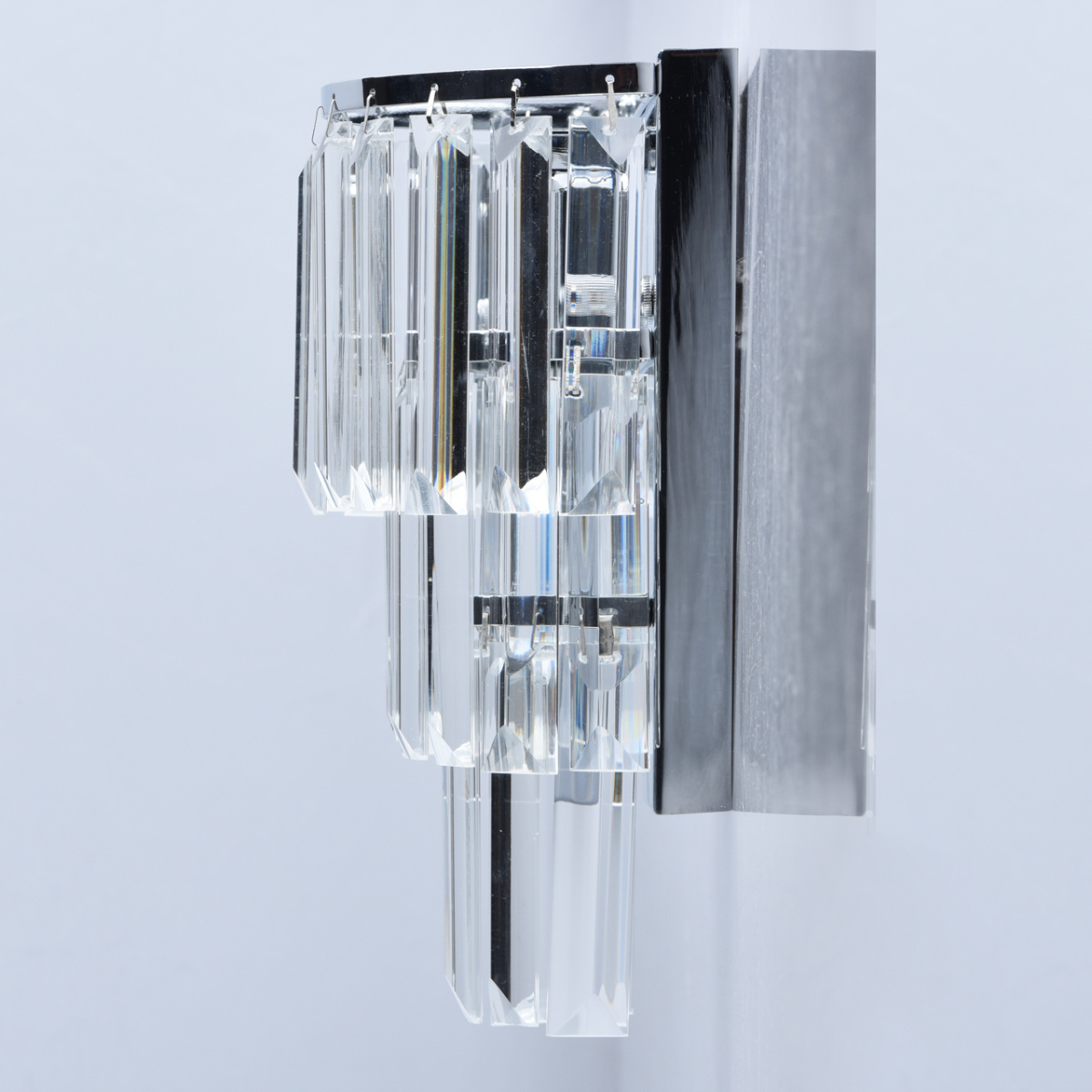 Основание бра выполнено из металла и гальванизировано в цвет хрома. Светильник декорирован прозрачным хрусталем прямоугольной формы.
