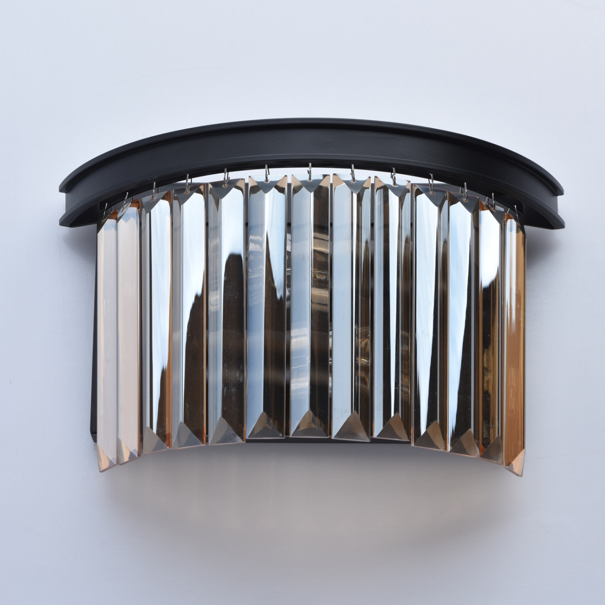 Основание бра выполнено из металла и окрашено в черный матовый цвет. Светильник декорирован хрусталем прямоугольной формы, гальванизированным в цвет шампань.