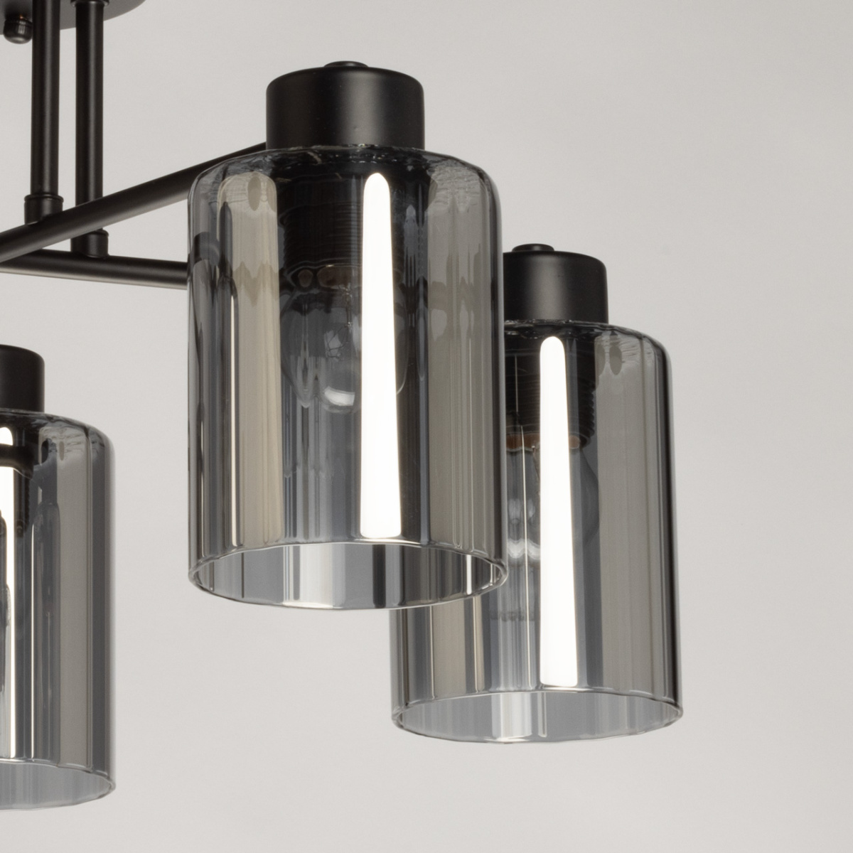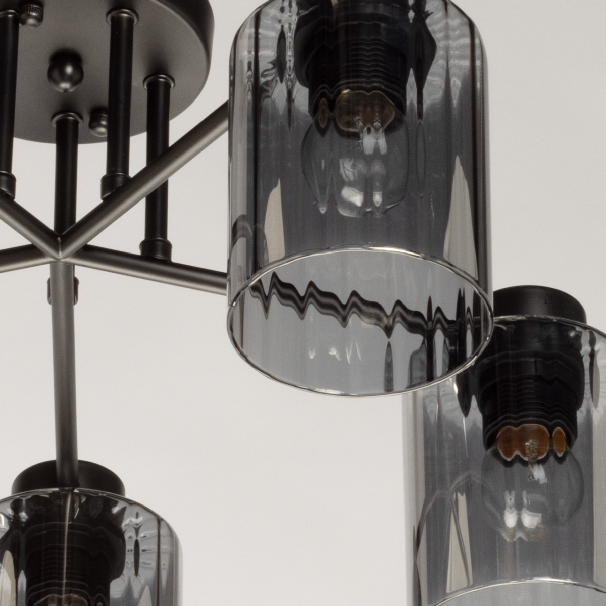 Элегантная потолочная люстра, выполненная в индустриальном стиле, станет стильным и функциональным дополнением любого интерьера. Её конструкция представляет собой пять изящных рожков из матового чёрного металла. Каждый рожок венчает цилиндрический плафон из дымчатого стекла, создающего мягкое, рассеянное освещение. Дымчатый оттенок стекла придает свету особую глубину и теплоту, прекрасно гармонируя с металлическим каркасом. Такая комбинация материалов создает интересный контраст текстур, что позволяет люстре эффектно смотреться как в классическом, так и в современном интерьере. Минимальная высота люстры составляет всего 24,5 см, что делает её подходящей для помещений с невысокими потолками.