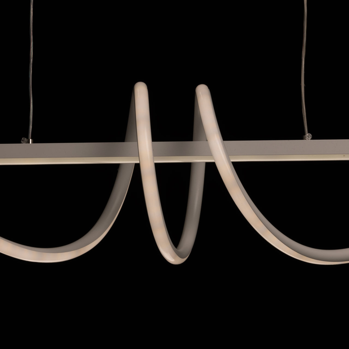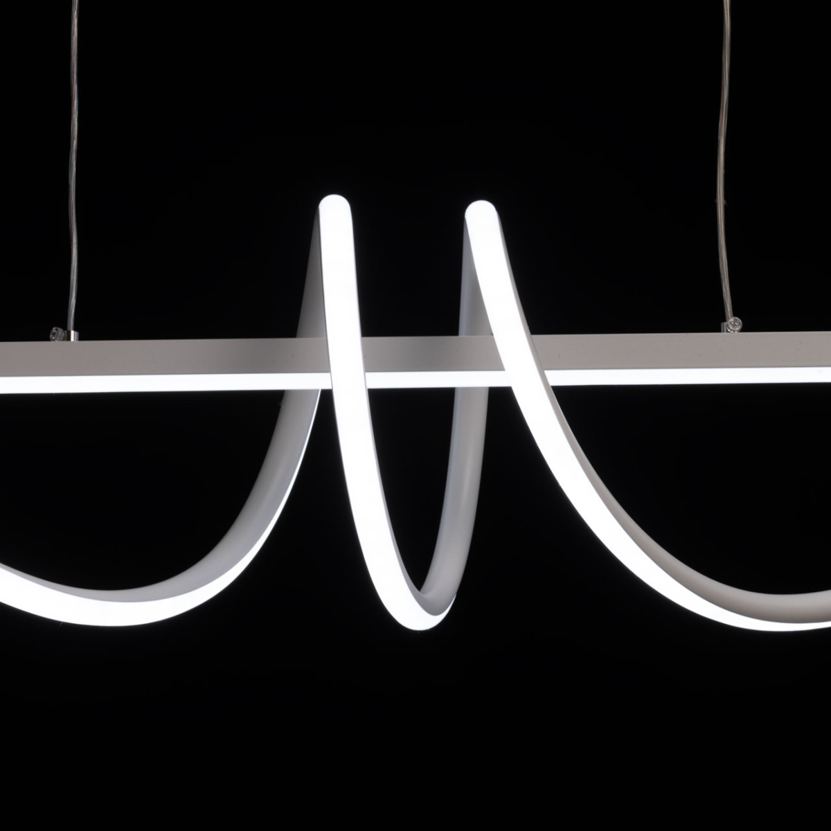 Металлическое основание потолочной люстры окрашено в белый цвет. Плафон люстры выполнен из сплава алюминия с цинком и окрашен в цвет основания. Светодиодные источники света закрыты белым акрилом.