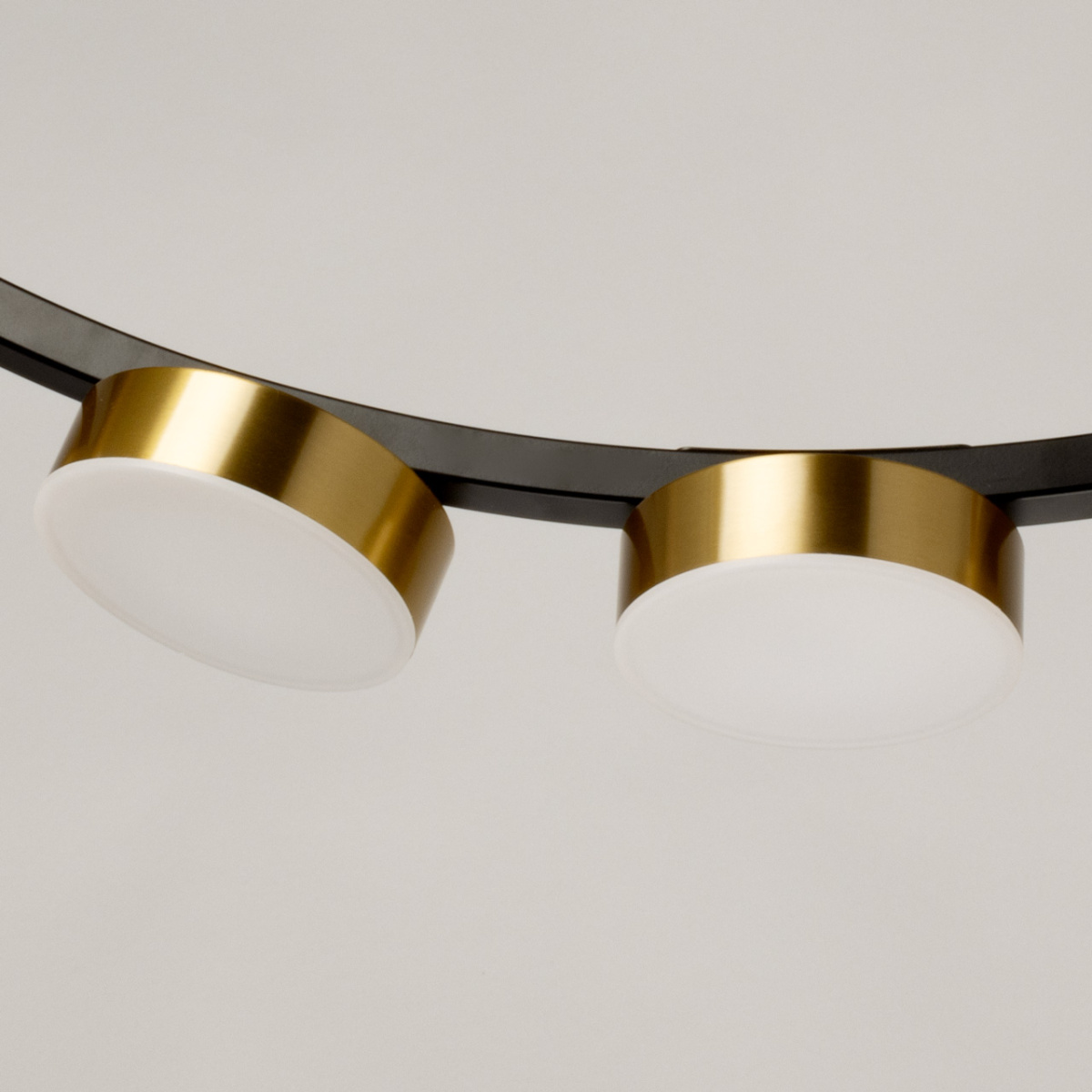 Основным элементом светильника Гэлэкси является изогнутое основание, выполненное в элегантном черном цвете. Это решение придает изделию брутальность и лаконичность, что делает его идеальным выбором для интерьеров с высокими потолками. Элементы, гальванизированные в цвет бронзы, добавляют нотку роскоши и подчеркивают современный стиль, что позволяет светильнику гармонично вписаться в различные дизайнерские концепции — от минимализма до лофта.Металл, использованный в конструкции, обеспечивает надежность и долговечность светильника. Плафоны светильника имеют стильный дизайн в форме таблетки, что перекликается с общей концепцией.Светильник Гэлэкси оснащен современными светодиодами, которые обеспечивают яркое и равномерное освещение помещения площадью до 20 квадратных метров. Использование светодиодов позволяет значительно экономить на электроэнергии, а также продлевает срок службы светильника. Эти источники света известны своей высокой эффективностью и низким тепловыделением, что делает их идеальными для использования в любых помещениях, будь то гостиные, холлы, офисы или рестораны.Еще одной изюминкой светильника Гэлэкси является возможность регулировки высоты подвеса. Это позволяет установить его на комфортную для вас высоту. Кроме того, светильник имеет функцию переключения цветовой температуры от 3000K до 6000K, что позволяет легко адаптировать освещение под различные нужды и настроения. Переключение осуществляется с помощью обычного выключателя на стене, что делает его использование максимально удобным.
