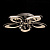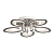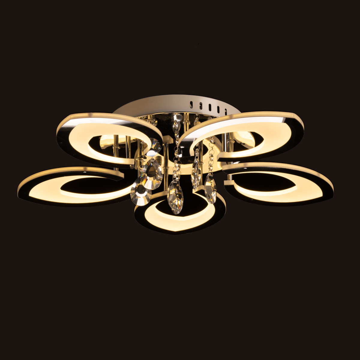 Металлическое основание потолочной люстры гальванизировано в цвет хрома. Светодиодные источники света закрыты белым акрилом. Люстра декорирована пластинами, гальванизированными в цвет хрома и подвесками из прозрачного хрусталя
