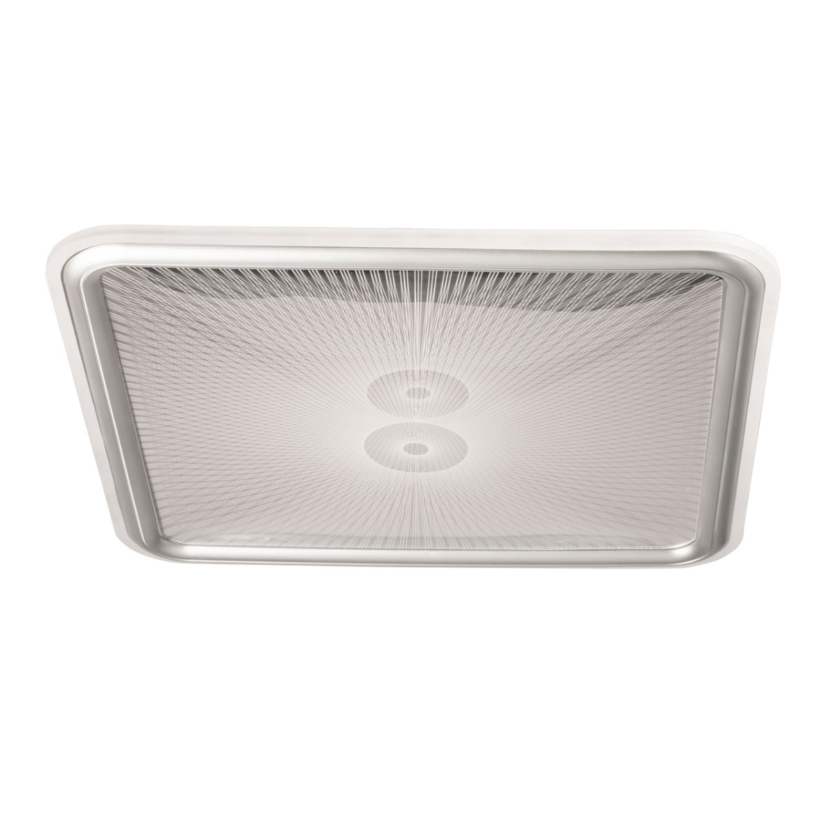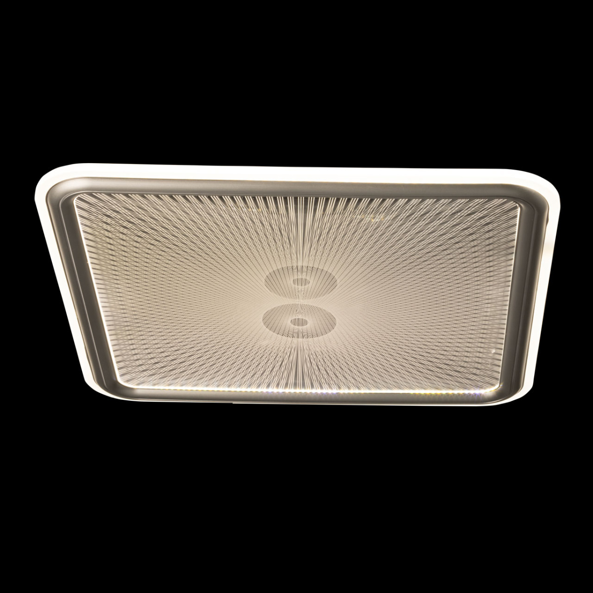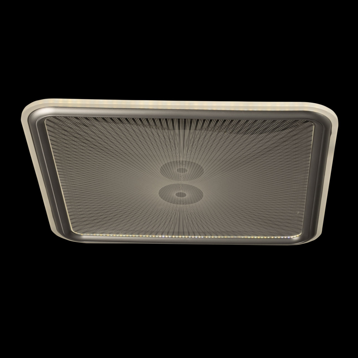 Металлическое основание светильника окрашено в белый цвет. Плафон выполнен из сплава алюминия с цинком и окрашен серый цвет. Светодиодные источники света закрыты белым матовым акрилом. Потолочная люстра декорирована металлической пластиной, гальванизированной в цвет хрома и прозрачным акрилом с 3D-эффектом.