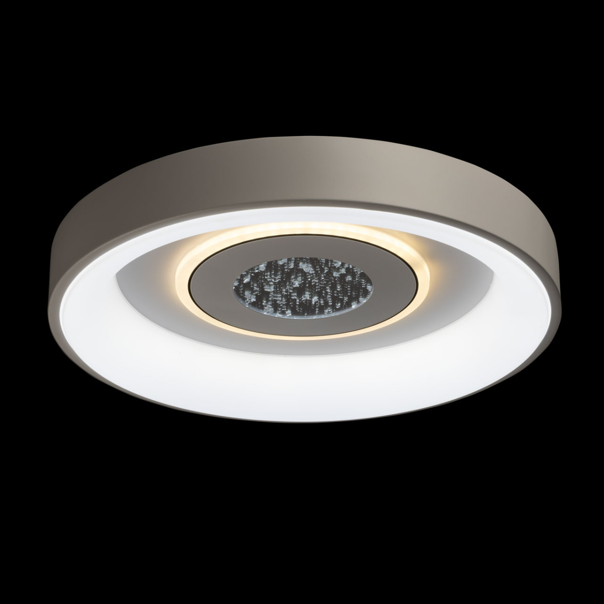 Металлическое основание потолочной люстры окрашено в белый цвет. Корпус плафона выполнен из сплава алюминия с цинком и окрашен в белый цвет. Светодиодные источники света закрыты матовым акрилом. Светильник декорирован пластиной, окрашенной в белый цвет с черным кантом, в центре пластины находится область с эффектом фольгирования цвета серебро.