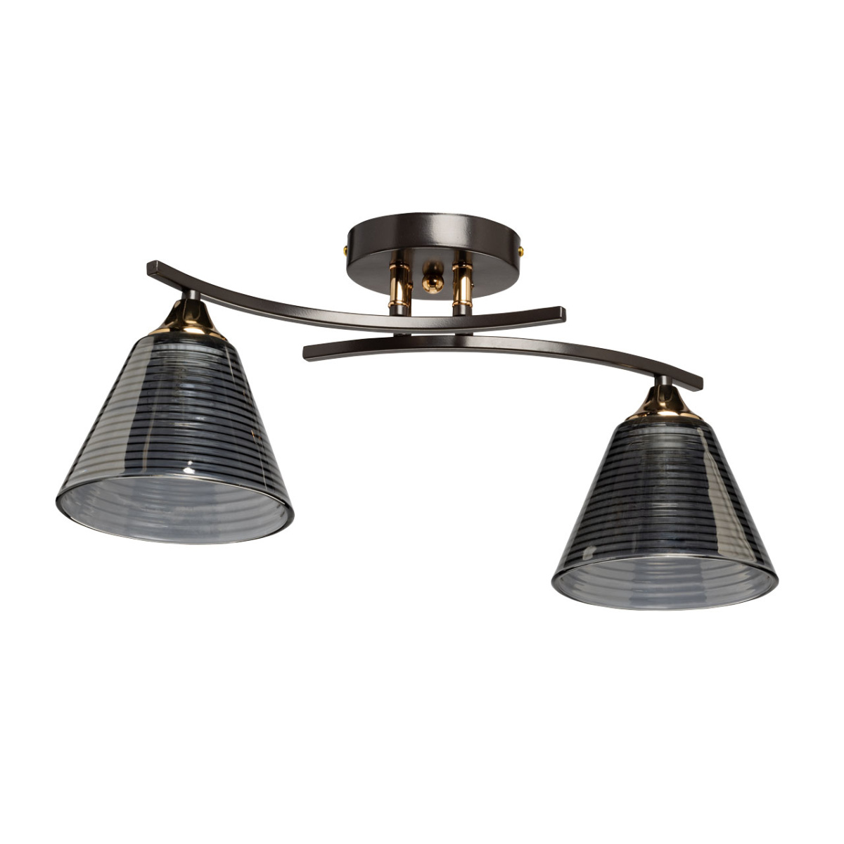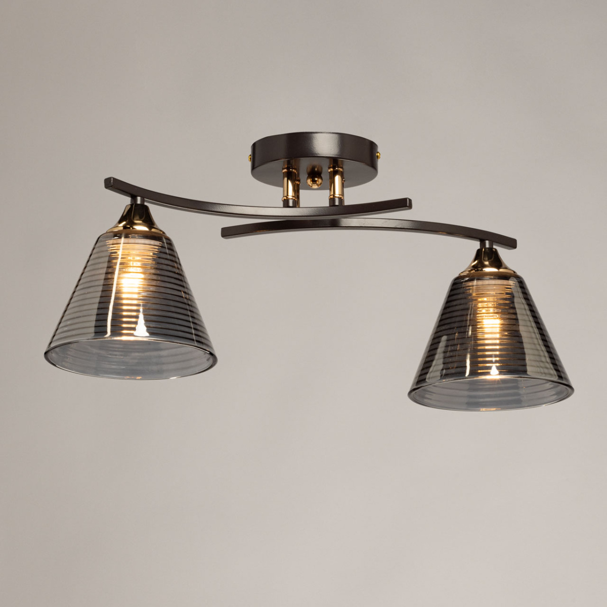 Основание светильника выполнено из металла и окрашено в цвет кофе. Отдельные элементы основания гальванизированы в цвет золота. Стеклянные плафоны отлиты в сложную форму с внутренней текстурой и гальванизированы в дымчатый цвет.