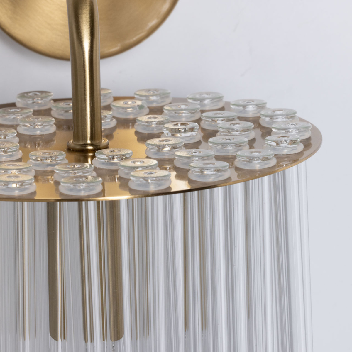Металлическое основание настенного бра гальванизировано в цвет латуни. Светильник декорирован прозрачными стеклянными трубочками.
