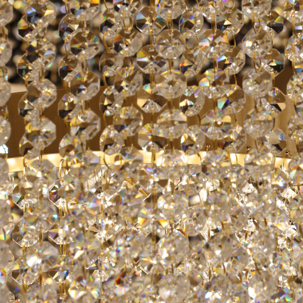 Основание люстры из нержавеющей стали гальванизировано в цвет золота. Люстра декорирована каскадом подвесок из прозрачного хрусталя.