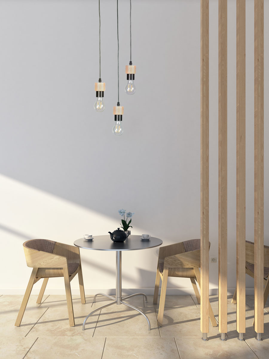 Металлическое основание подвеса окрашено в черный цвет. Подвес декорирован элементом из натурального дерева.