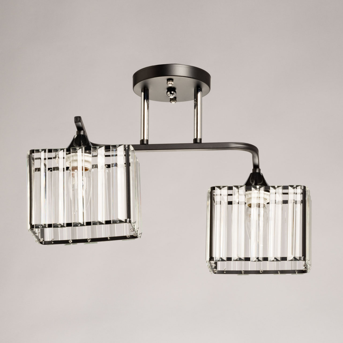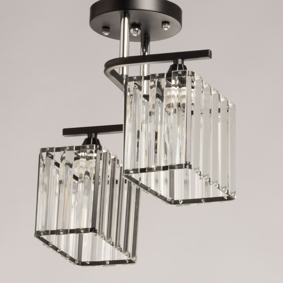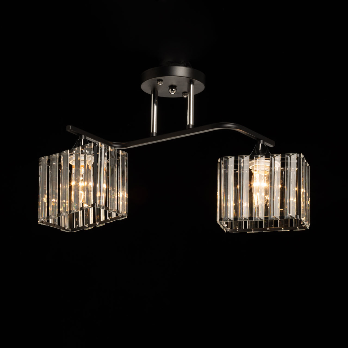 Металлическое основание светильника окрашено в черный цвет, отдельные элементы гальванизированы в цвет хрома. Плафоны люстры декорированы прозрачным стеклом прямоугольной формы со сложной огранкой.