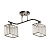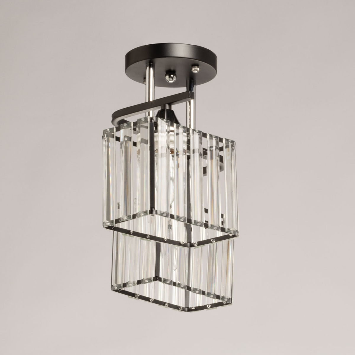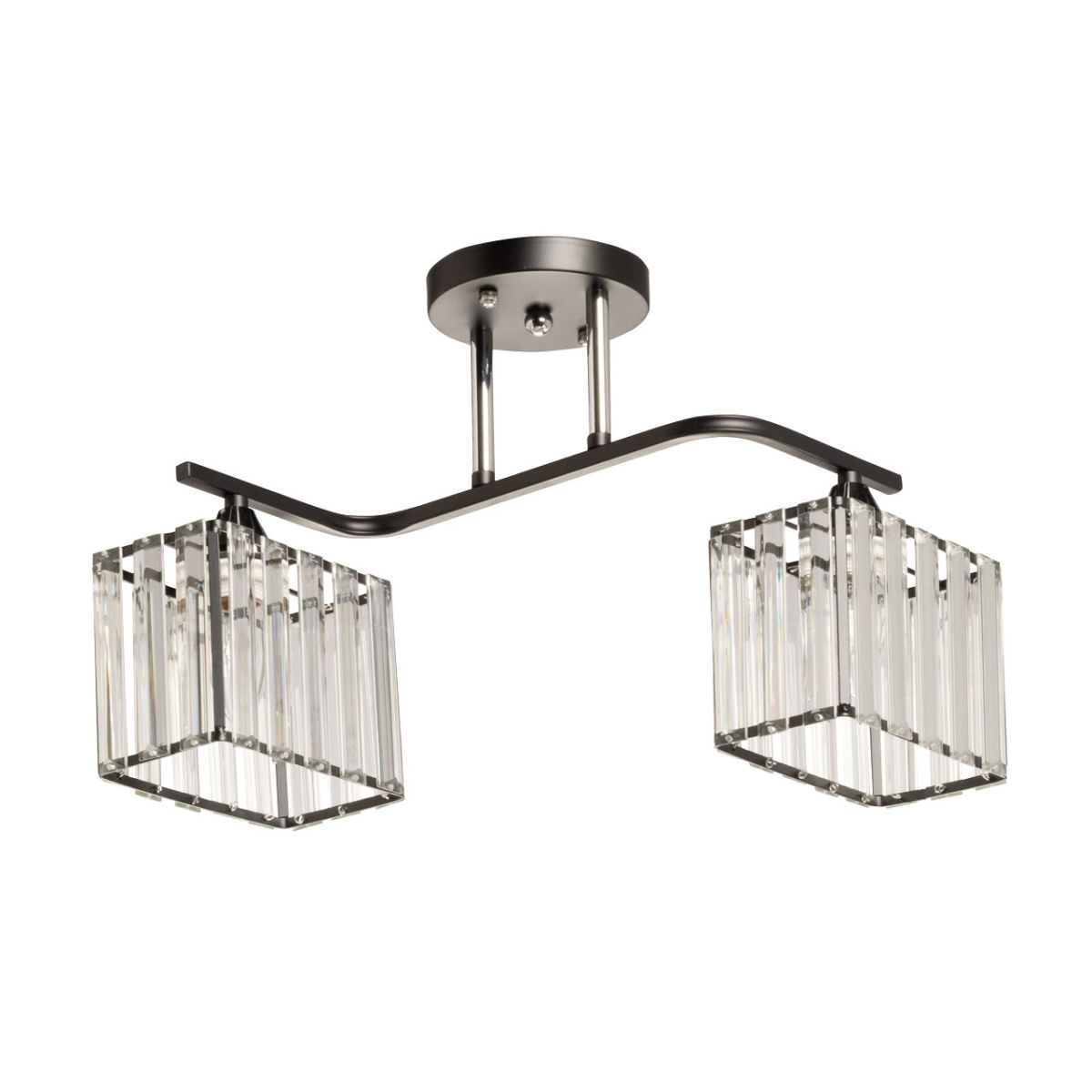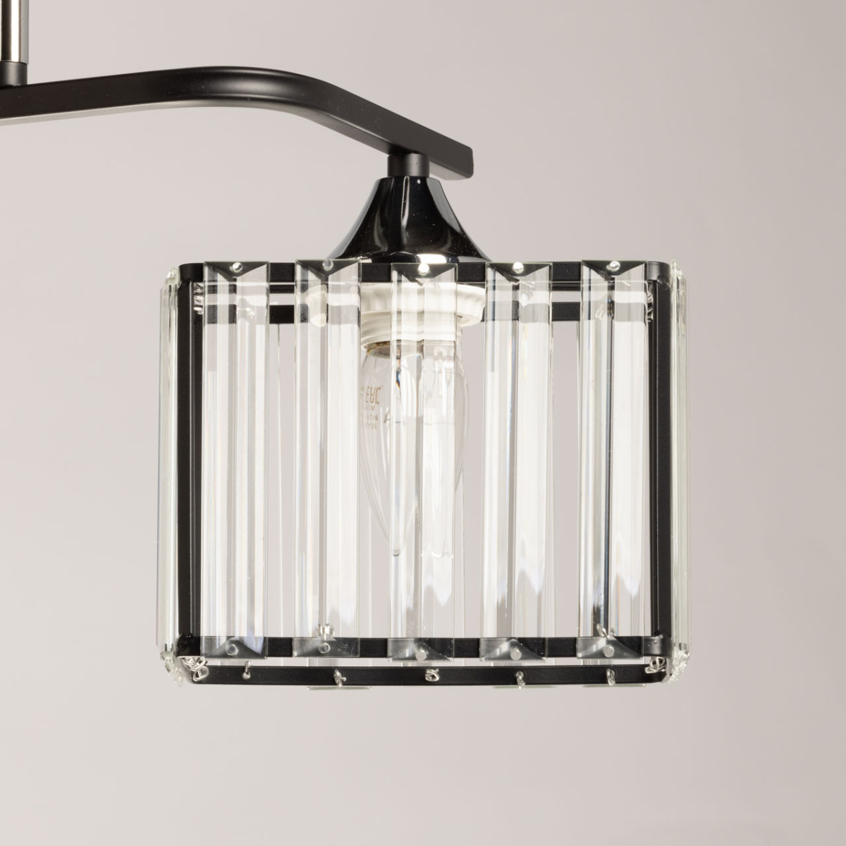 Металлическое основание светильника окрашено в черный цвет, отдельные элементы гальванизированы в цвет хрома. Плафоны люстры декорированы прозрачным стеклом прямоугольной формы со сложной огранкой.