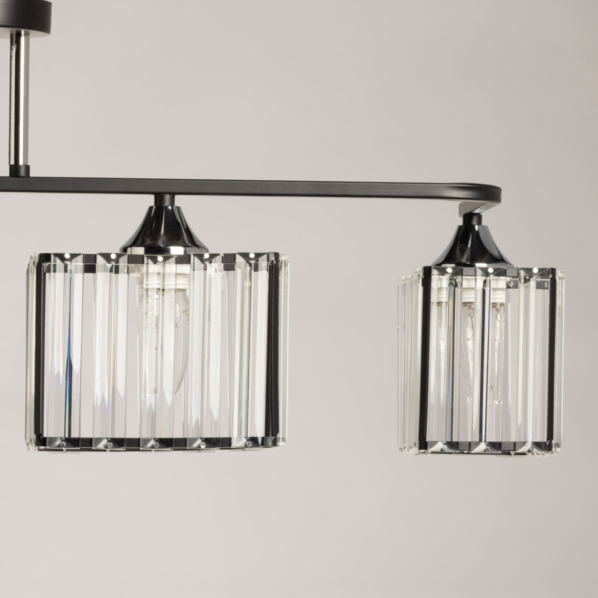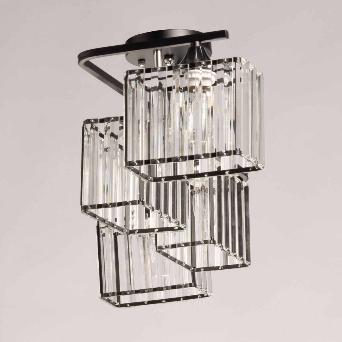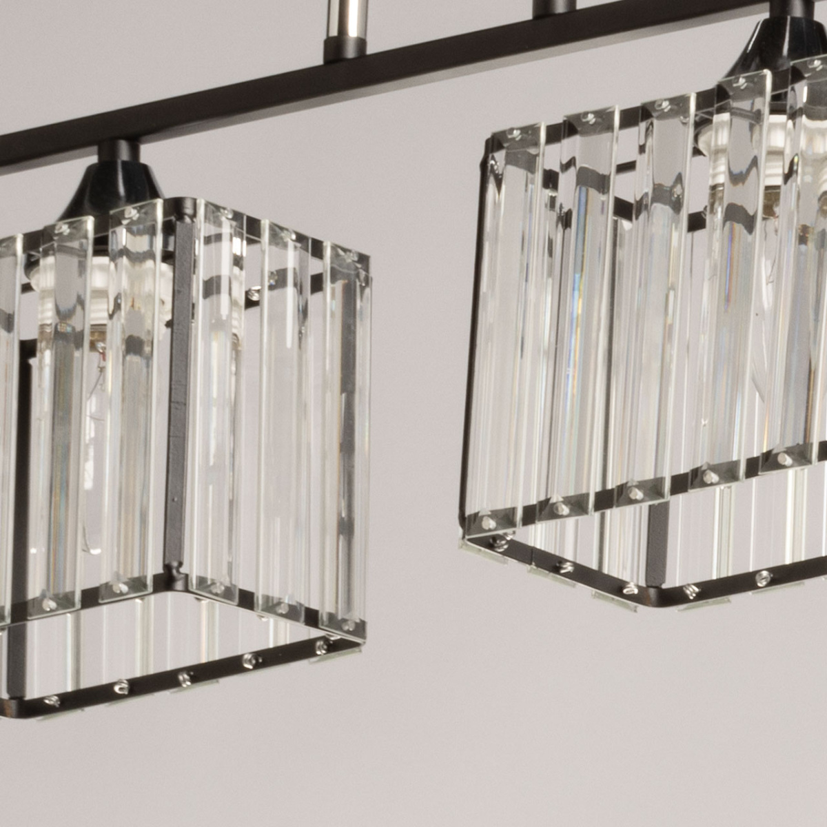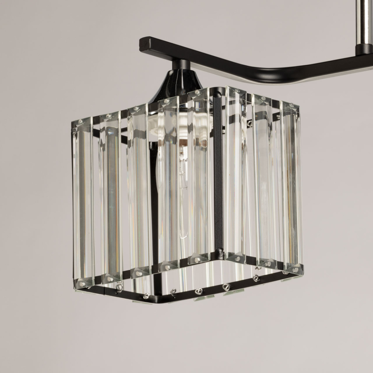 Металлическое основание потолочной люстры окрашено в черный цвет. Отдельные элементы основания гальванизированы в цвет хрома. Плафоны декорированы прозрачным стеклом прямоугольной формы.