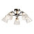 Металлическое основание потолочной люстры окрашено в черный цвет. Отдельные элементы основания гальванизированы в цвет французского золота. Люстра декорирована плафонами из прозрачного фактурного стекла.