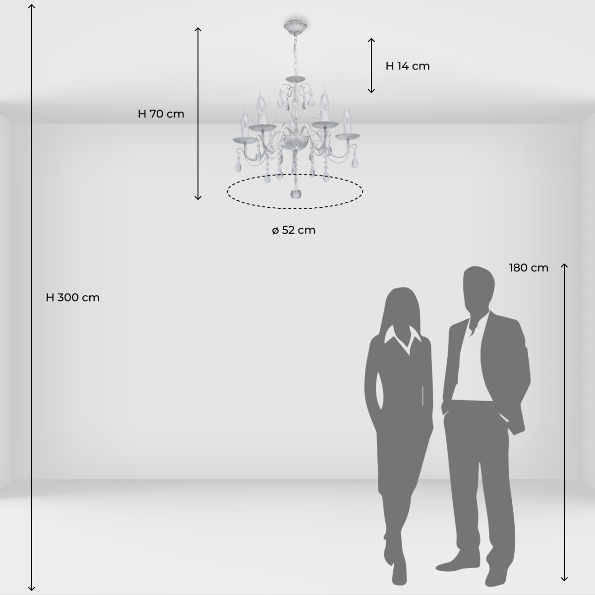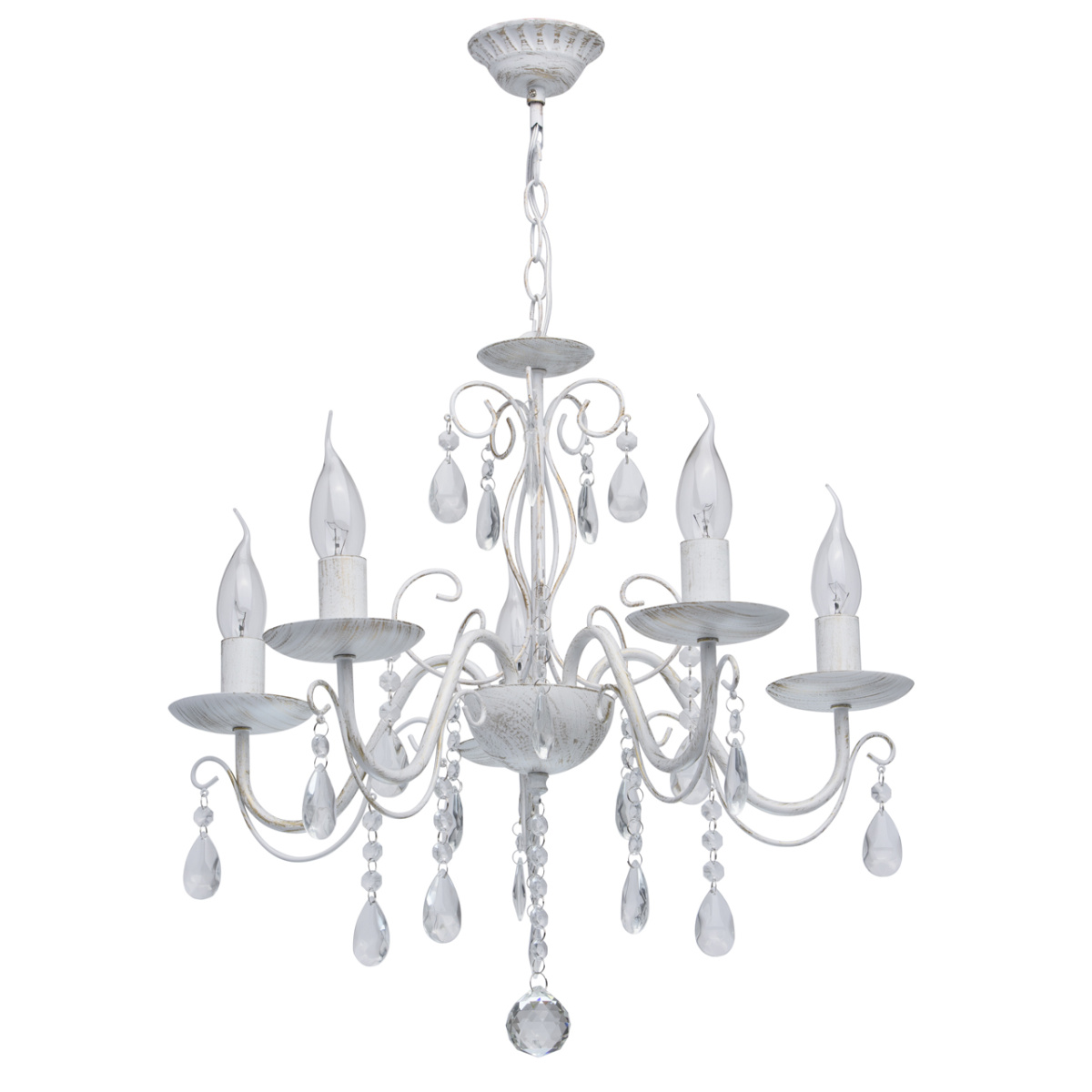 Основание светильника выполнена из металла и окрашена по технологии хай-лайт, основный слой - белый, декоративный слой - золотого цвета. Декор: подвески из декоративного стекла.