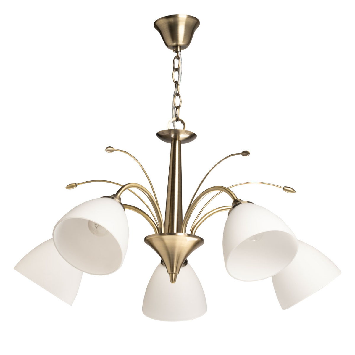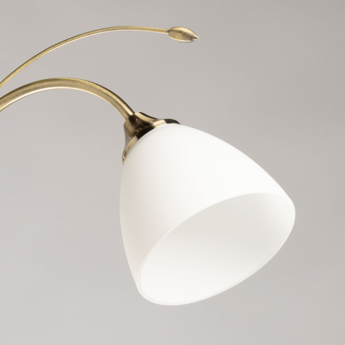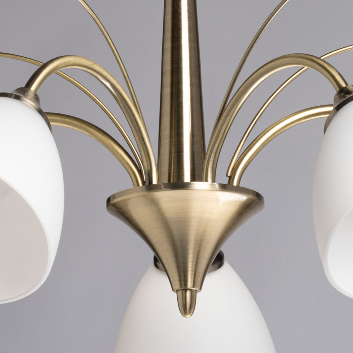 Металлическое основание светильника гальванизировано в цвет античной бронзы. Традиционные источники света закрыты стеклянными плафонами, окрашенными в белый цвет с внутренней стороны.