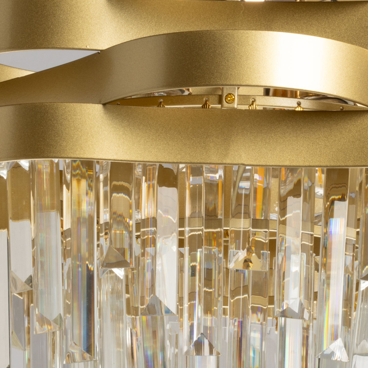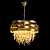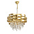 Металлическое основание подвесной люстры гальванизировано в цвет золота. Плафон выполнен из металлических волнистых элементов, окрашенных в цвет перламутрового золота. Люстра декорирована прозрачным хрусталем прямоугольной формы.