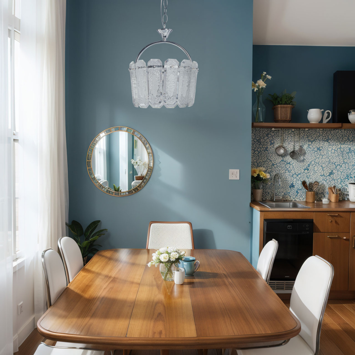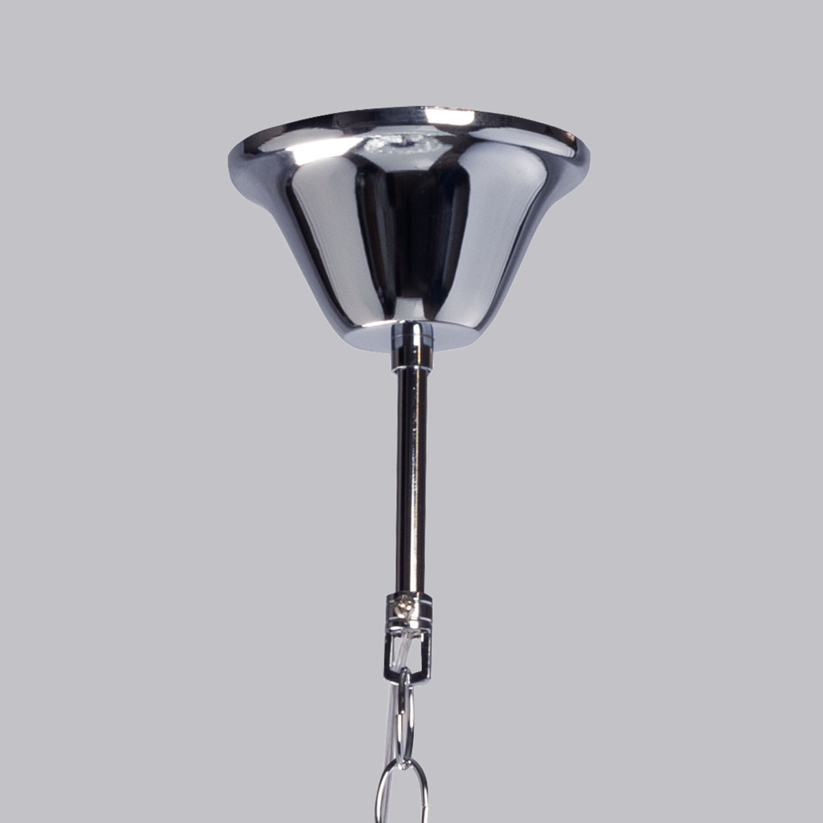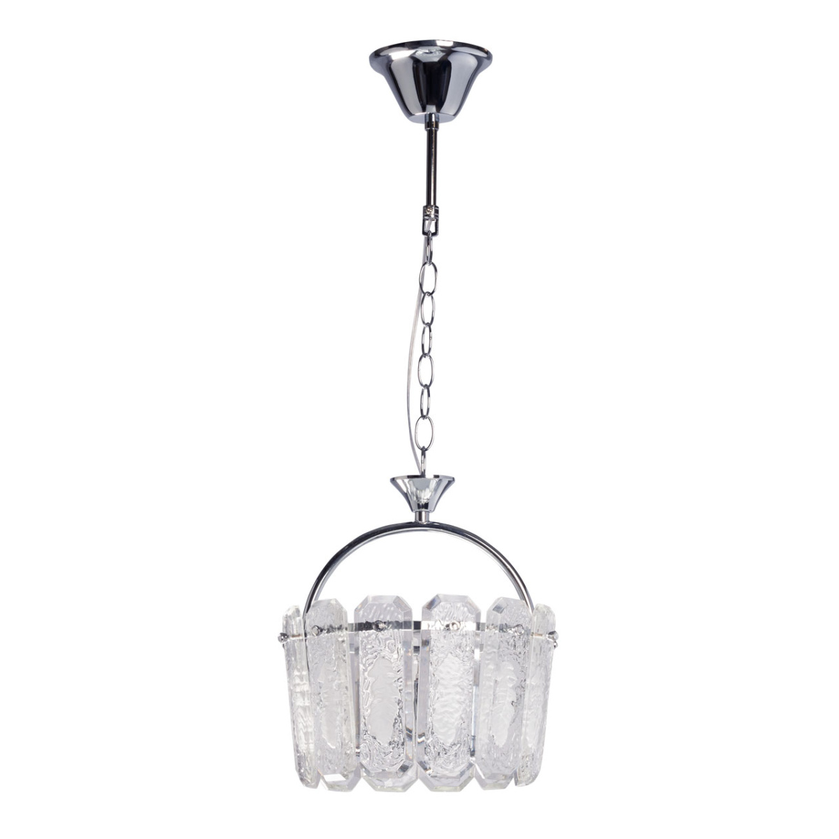 Металлическое основание люстры гальванизировано в цвет хрома. Плафон выполнен из прозрачного фактурного хрустального стекла овальной формы.