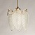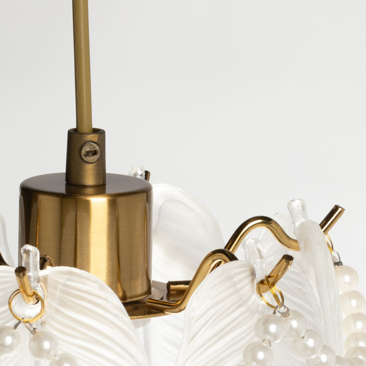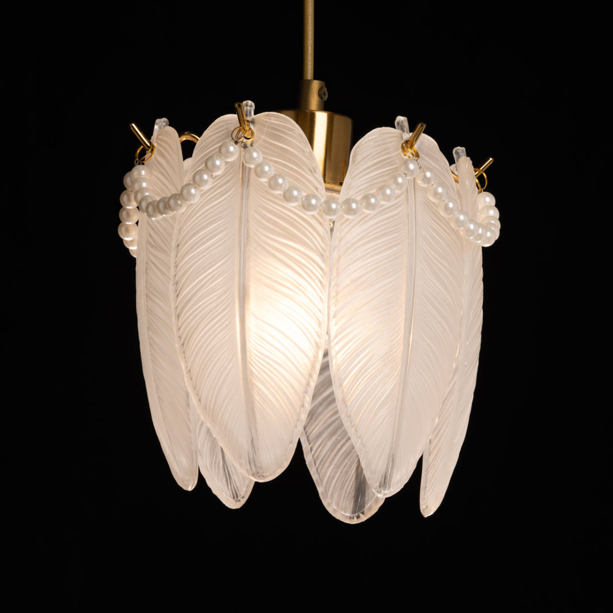 Металлическое основание подвесной люстры гальванизировано в цвет золота. Люстра декорирована матированными стеклянными элементами в форме листьев, а также бусами с имитацией жемчуга.