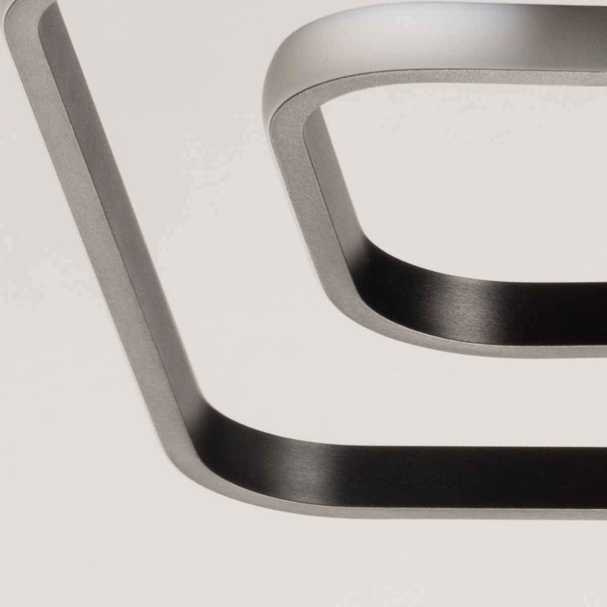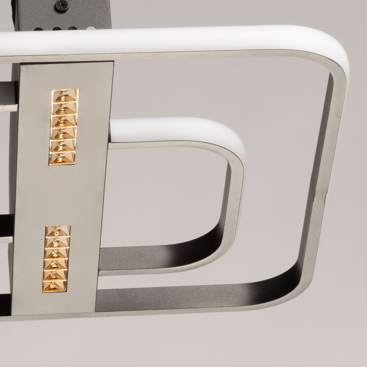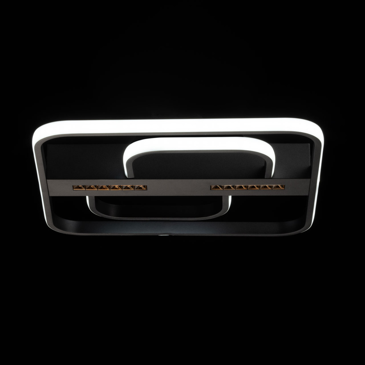 Металлическое основание светильника окрашено в черный цвет. Корпус плафона выполнен из сплава алюминия с цинком и окрашен в черный цвет. Светодиодные источники света закрыты белым матовым акрилом. В центре светильника расположены 2 пластины, гальванизированные в цвет золота, содержащие по 6 светодиодов. В комплекте с люстрой идет пульт управления, позволяющий регулировать температуру света и уровень яркости.