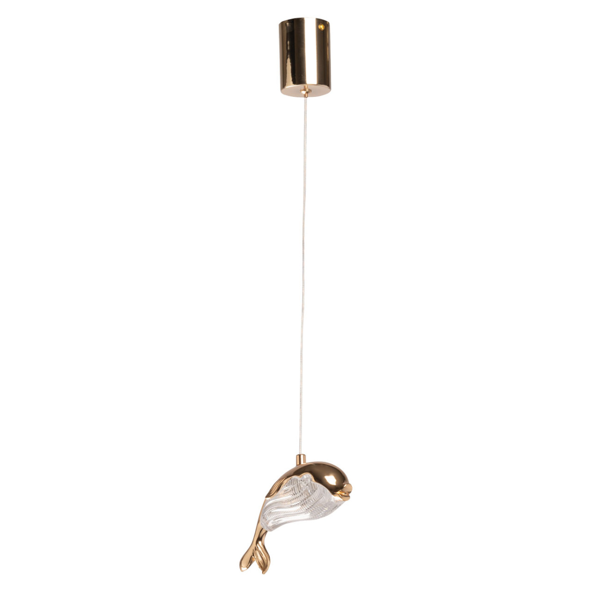 Металлическая потолочная чаша подвеса гальванизирована в цвет французского золота. Корпус плафона в виде дельфина выполнен из сплава алюминия с цинком по технологии художественного литья и гальванизирован в цвет основания. Светодиодный источник света закрыт прозрачным фактурным акрилом.