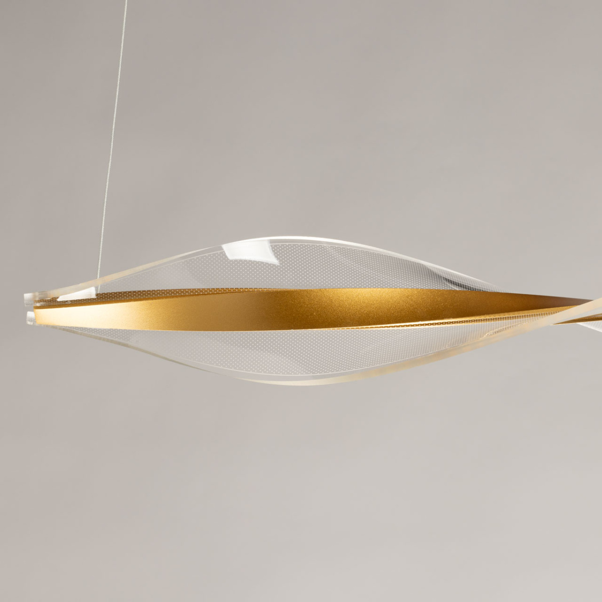 Металлическое основание подвесной люстры гальванизировано в цвет золота. Корпус плафона выполнен из сплава алюминия с цинком и гальванизирован в цвет основания. Люстра декорирована прозрачным акрилом с точечным рисунком оригинальной формы.