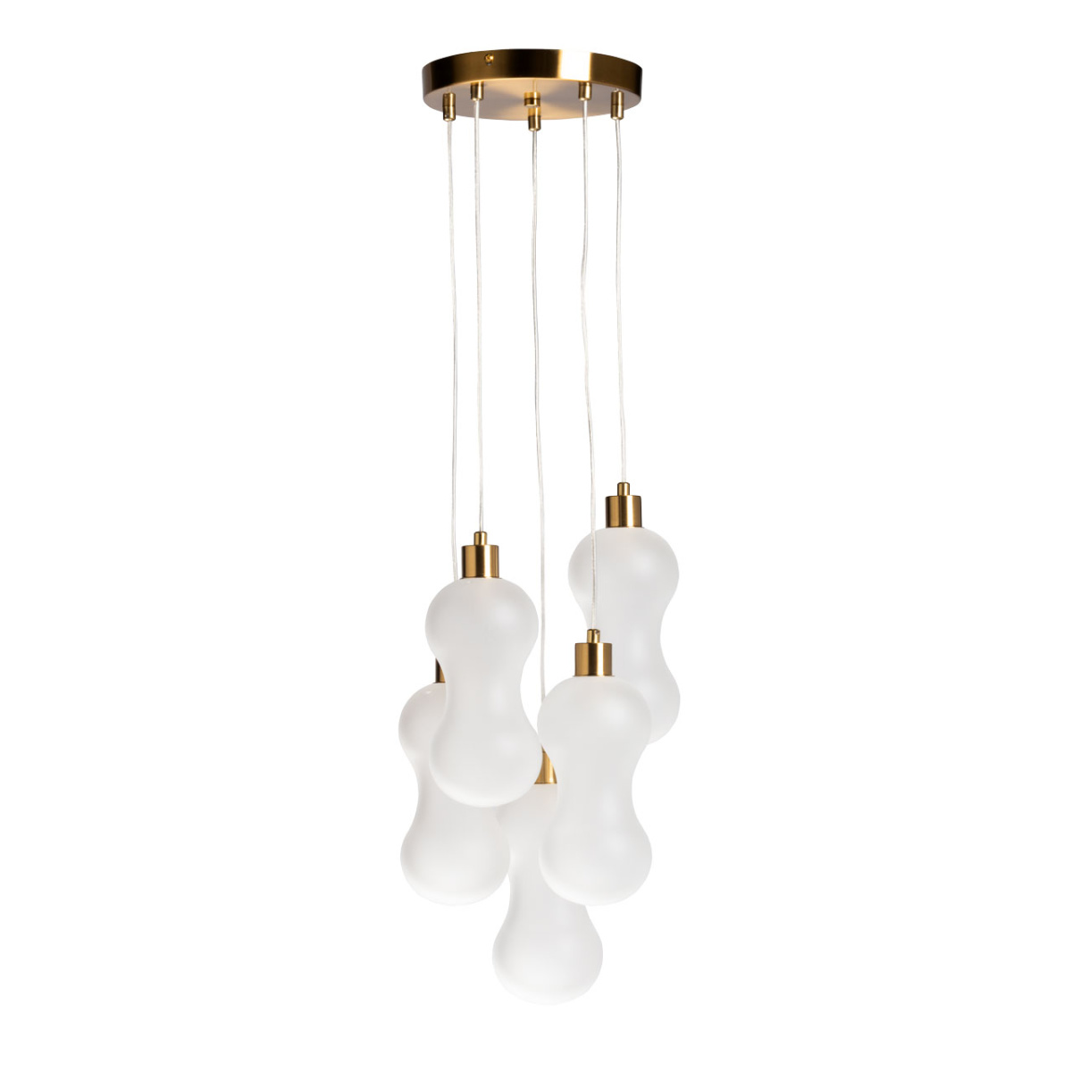 Металлическое основание подвесной люстры гальванизировано в цвет латуни. Стеклянные плафоны выдуваются в сложную форму и матированы изнутри.