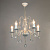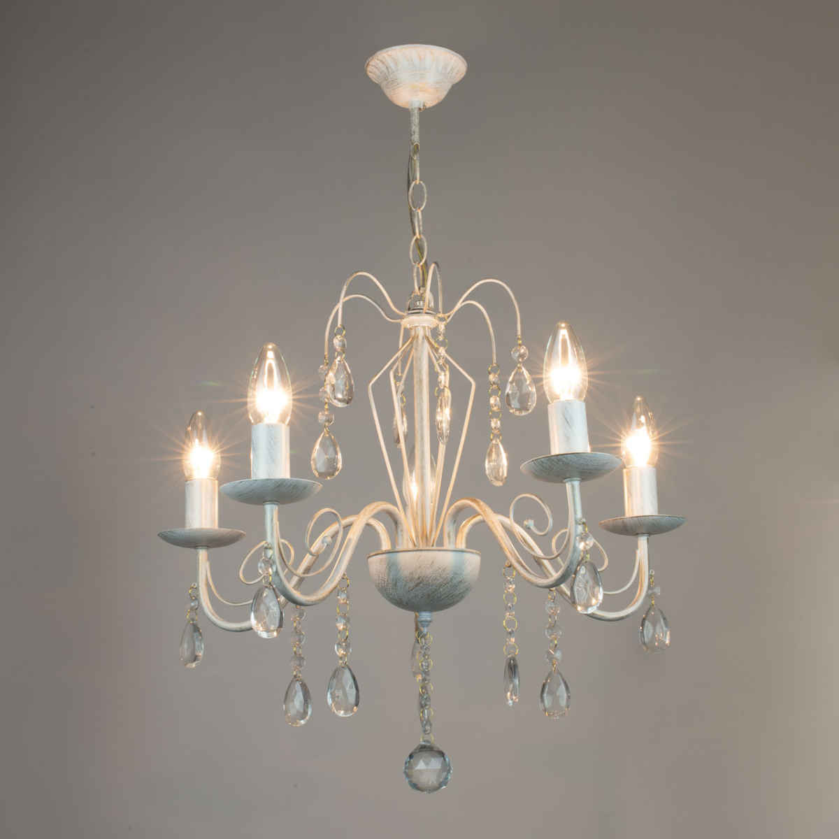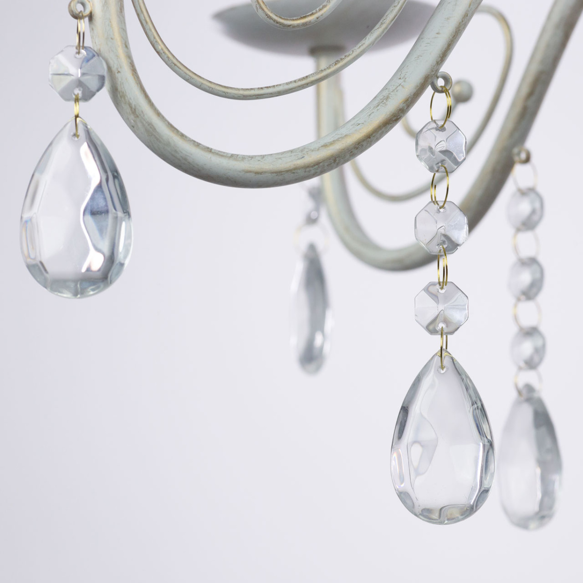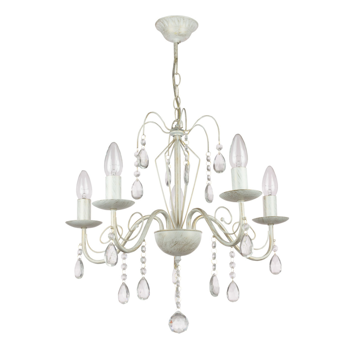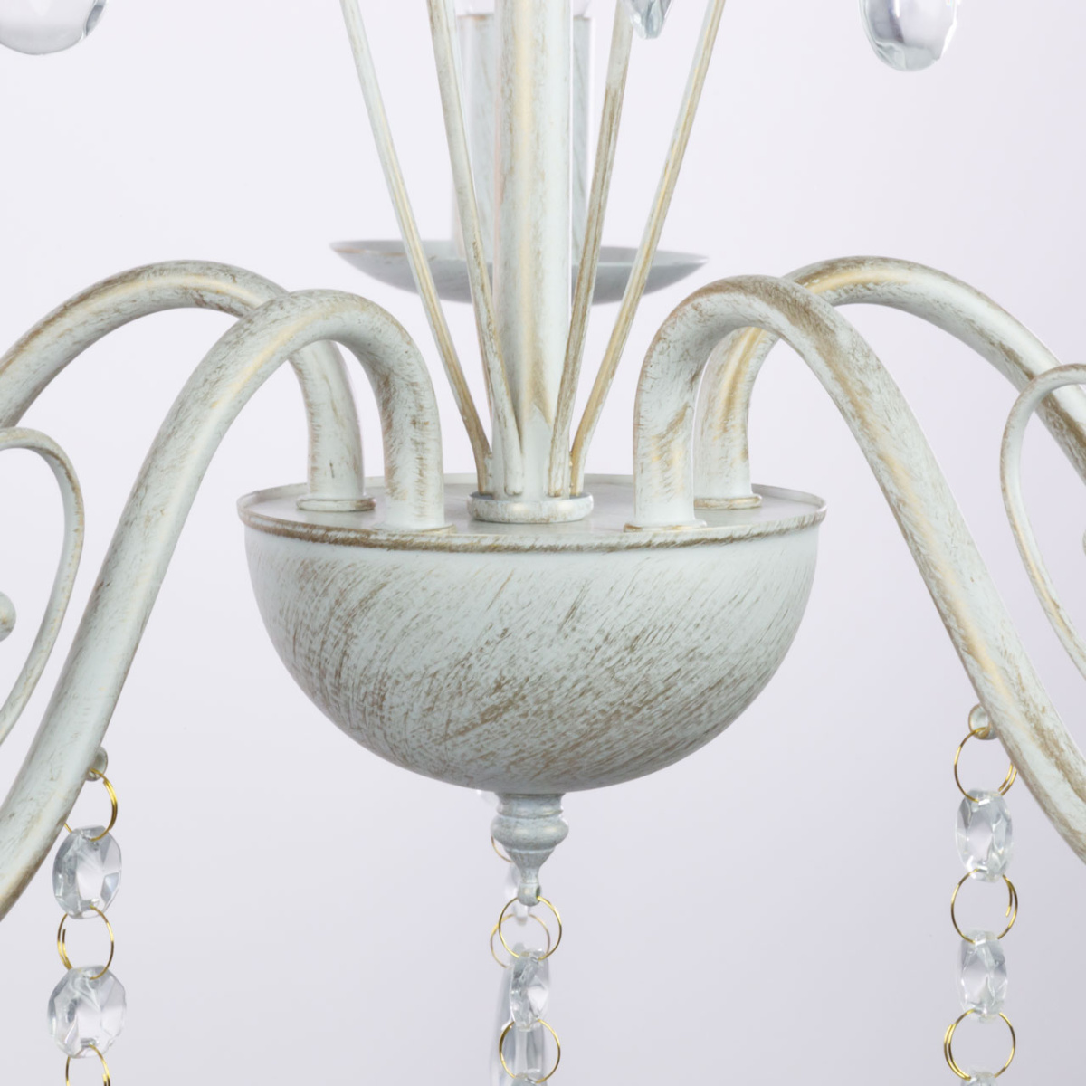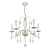Металлическое основание подвесной люстры окрашено по технологии хай-лайт, где на основной слой белого цвета наносится штрихами декоративный слой золотого цвета. Люстра декорирована прозрачным хрустальным стеклом миндалевидной формы.