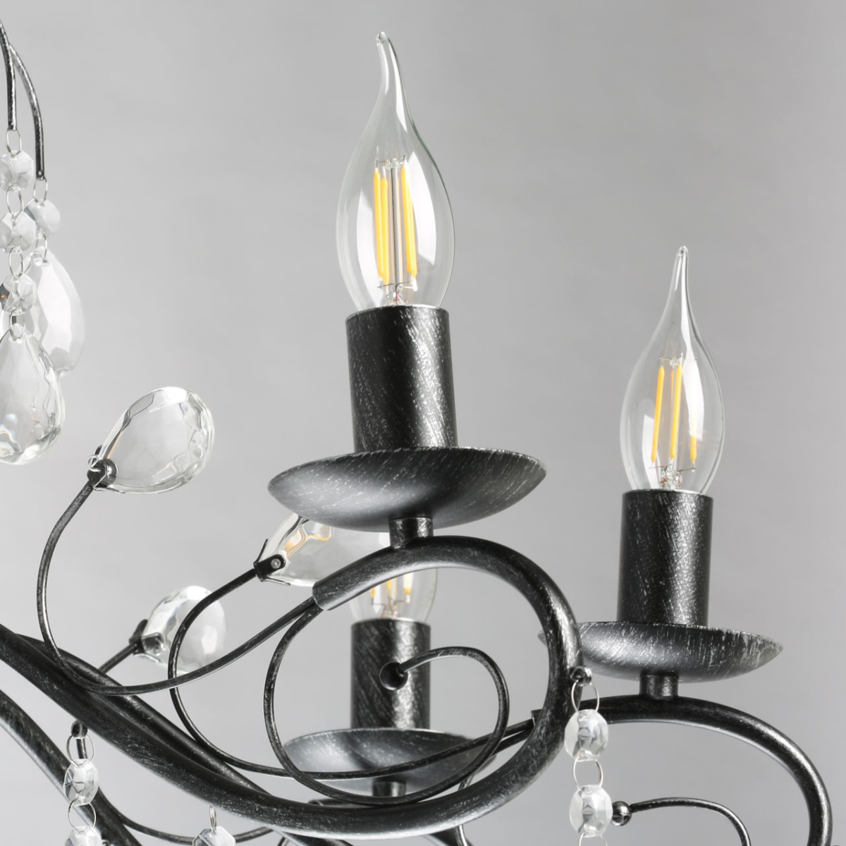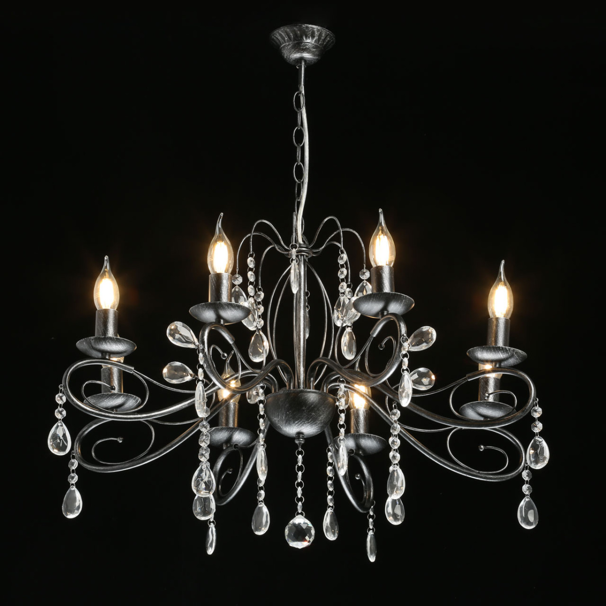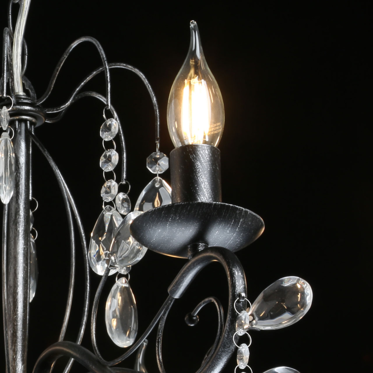Металлическое основание светильника окрашено в черный цвет и обработано по технологии хай-лайт в серебряный цвет. Светильник декорирован стеклянными подвесами миндалевидной формы и хрусталем в форме шара.