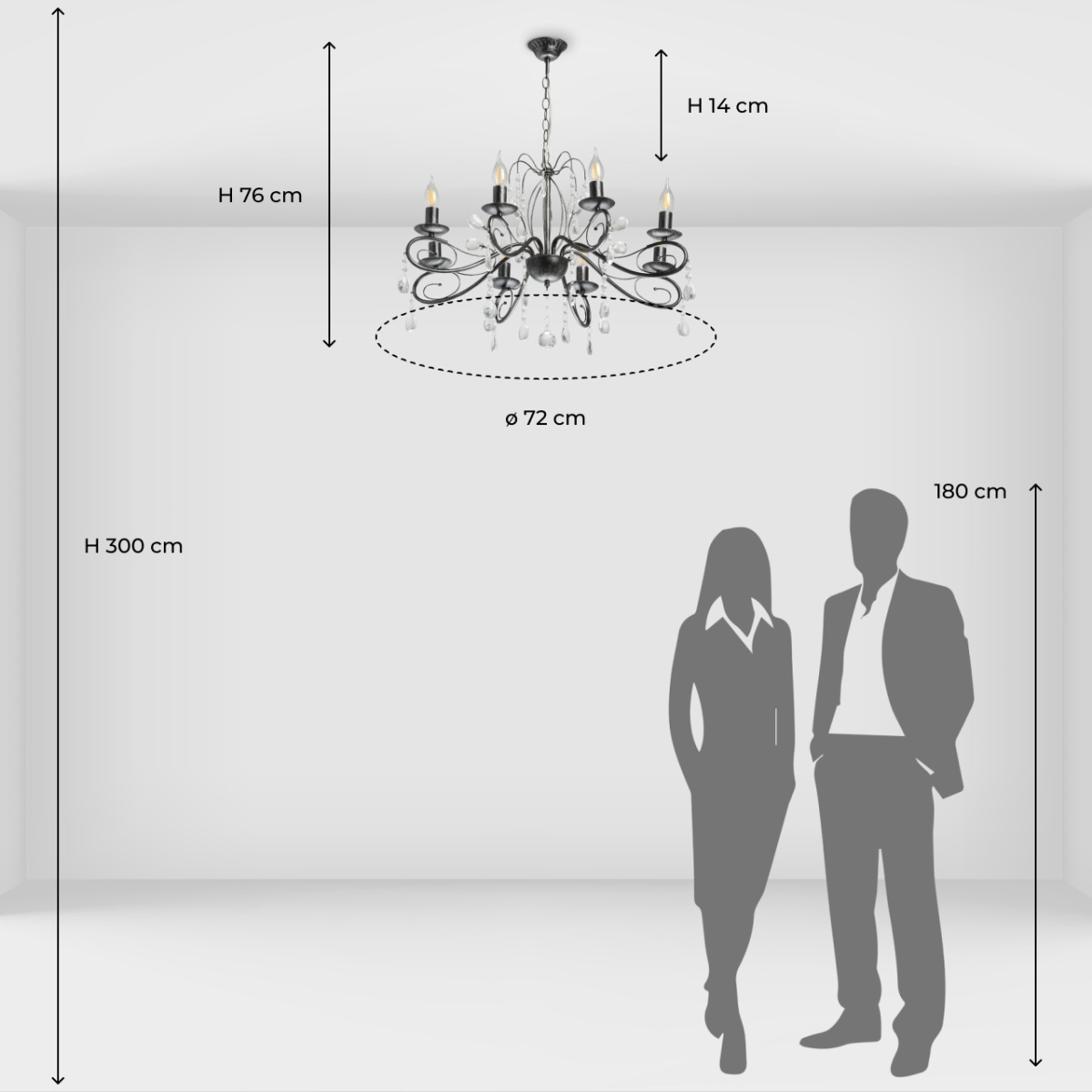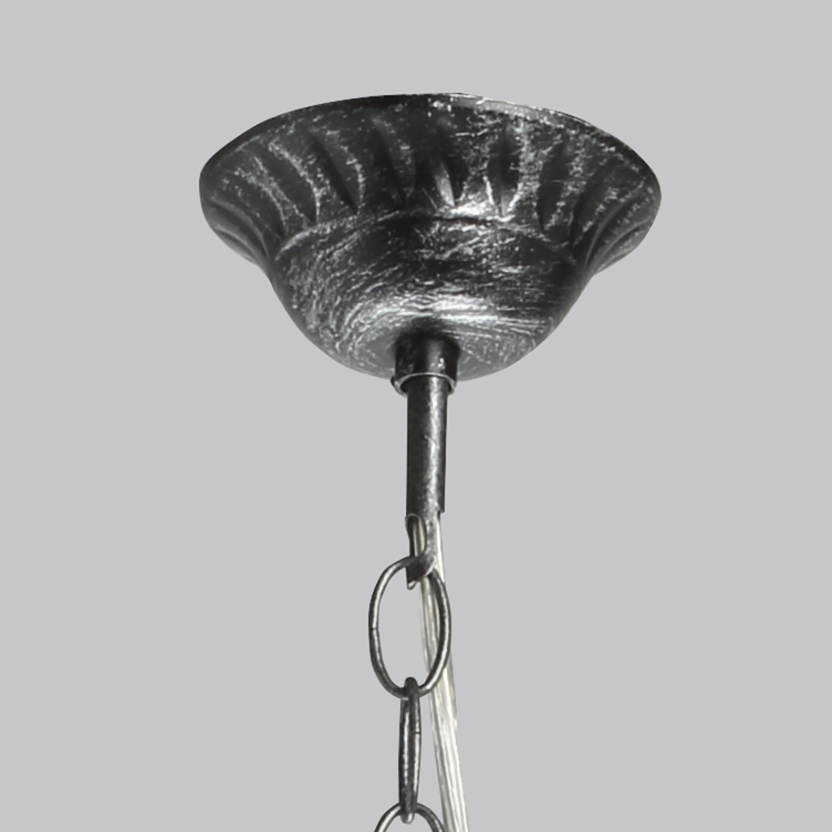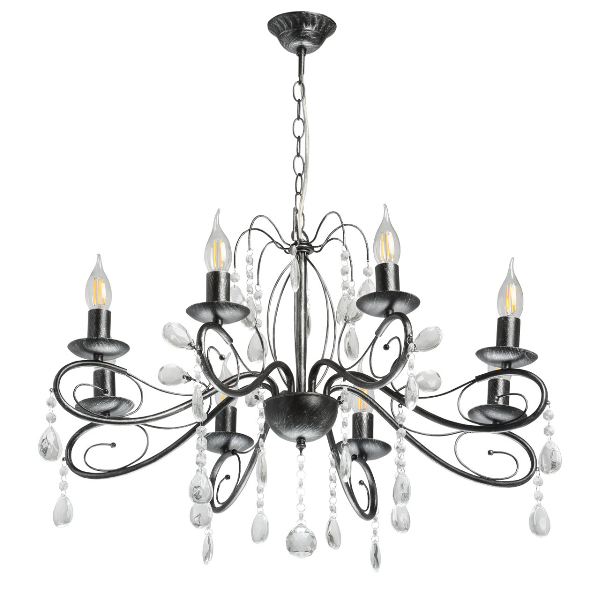 Металлическое основание светильника окрашено в черный цвет и обработано по технологии хай-лайт в серебряный цвет. Светильник декорирован стеклянными подвесами миндалевидной формы и хрусталем в форме шара.
