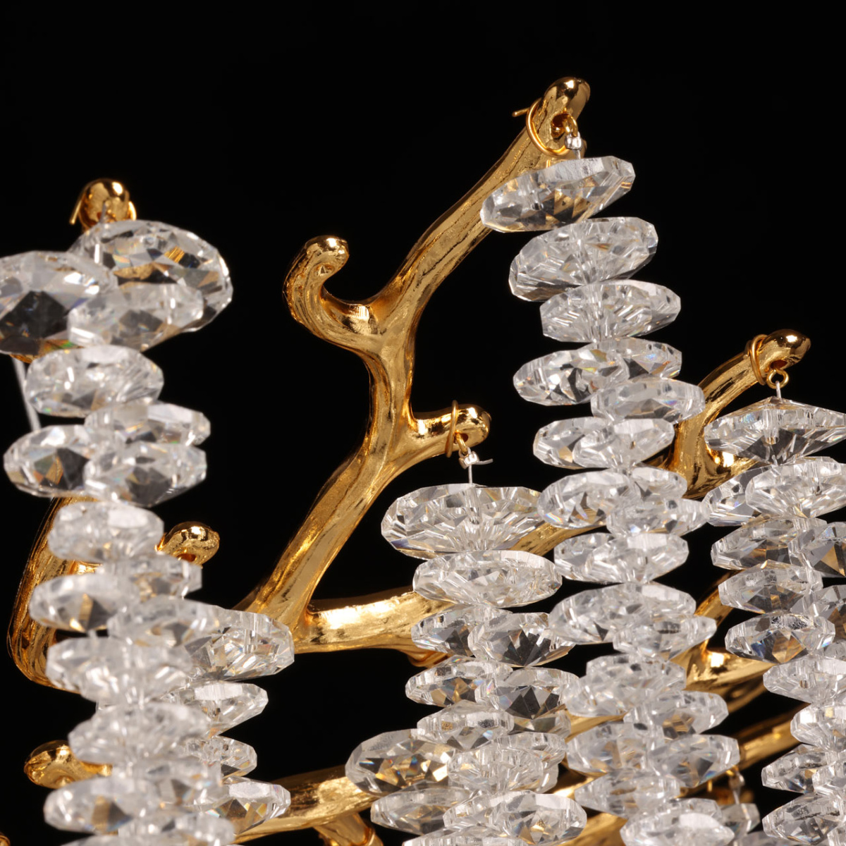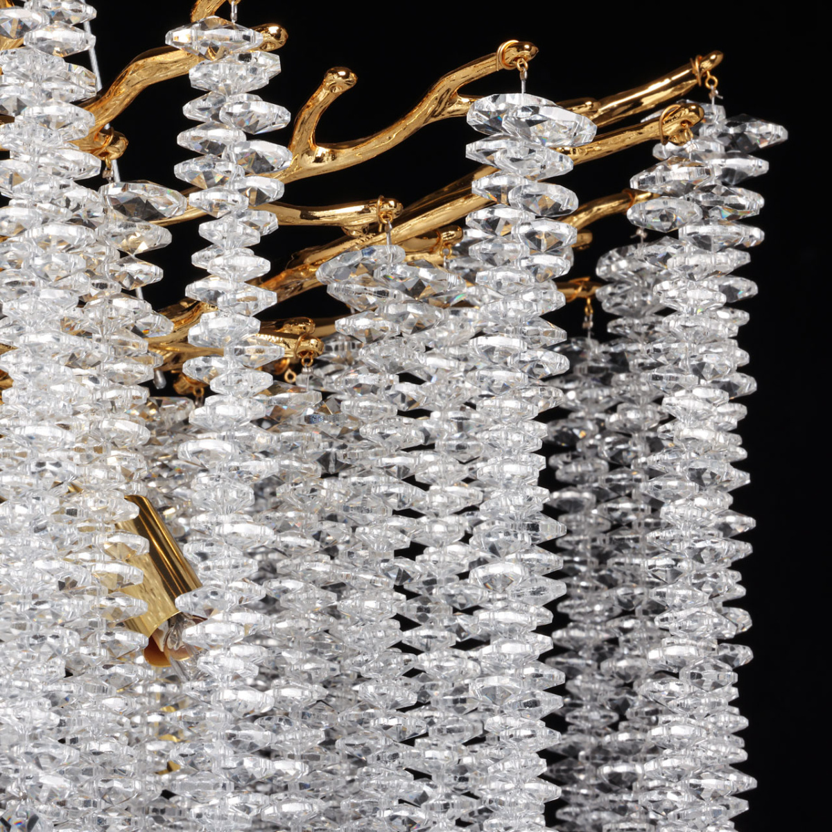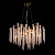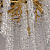 Основание подвесной люстры выполнено по технологии художественного литья из сплава алюминия с цинком и гальванизировано в цвет золота. Люстра декорирована гроздьями из прозрачного хрусталя. Потолочная чаша декорирована фактурной чеканкой.