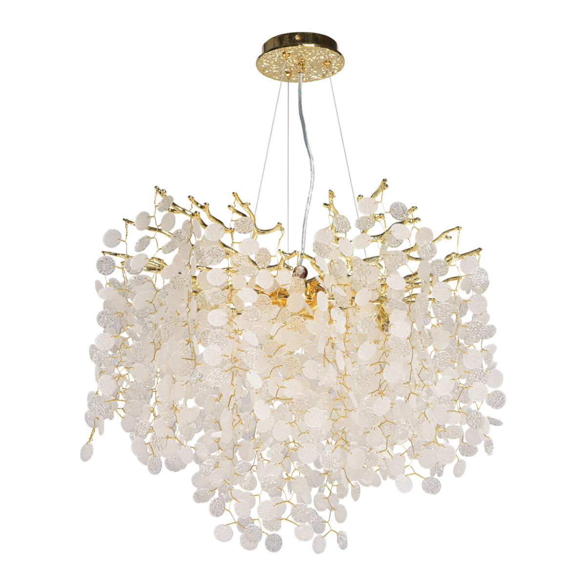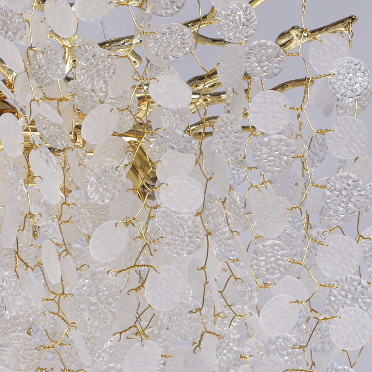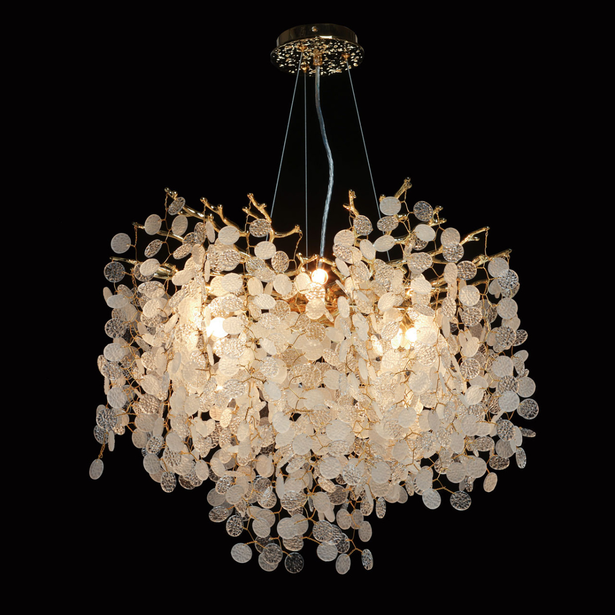 Основание подвесной люстры выполнено по технологии художественного литья из сплава алюминия с цинком и гальванизировано в цвет золота. Люстра декорирована прозрачным фактурным стеклом круглой формы.