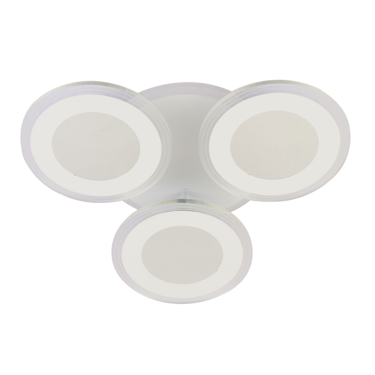 Металлическое основание потолочной люстры окрашено в белый цвет. Корпус плафонов выполнен из сплава алюминия с цинком и окрашен в цвет основания. Светодиодные источники света закрыты белым матовым акрилом. Люстра декорирована прозрачным акрилом с 3D-эффектом.