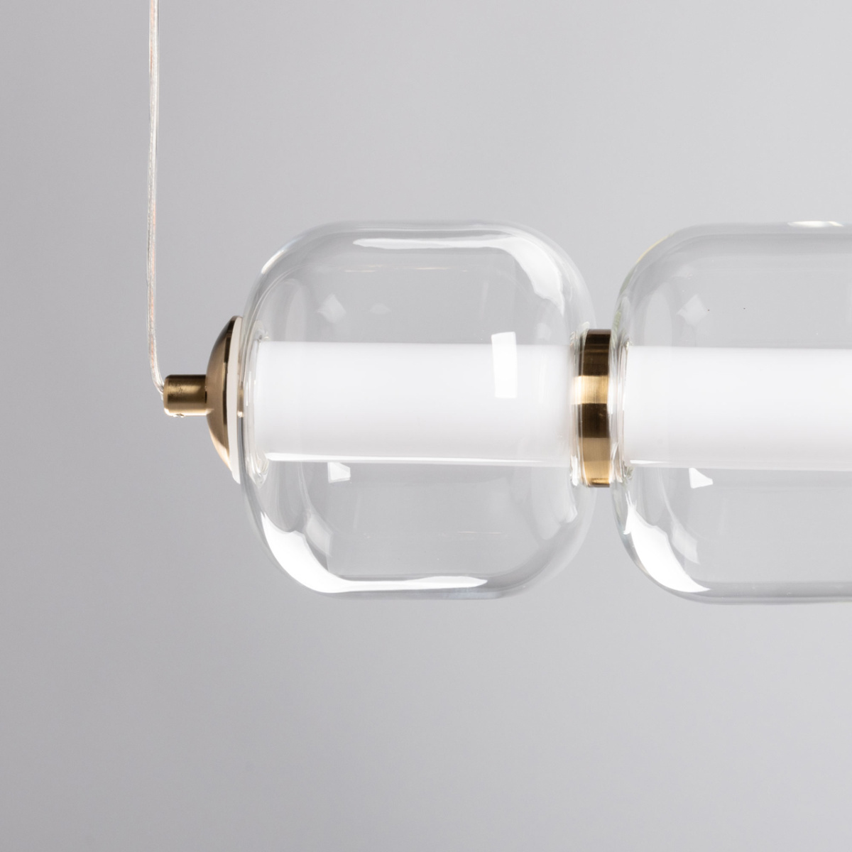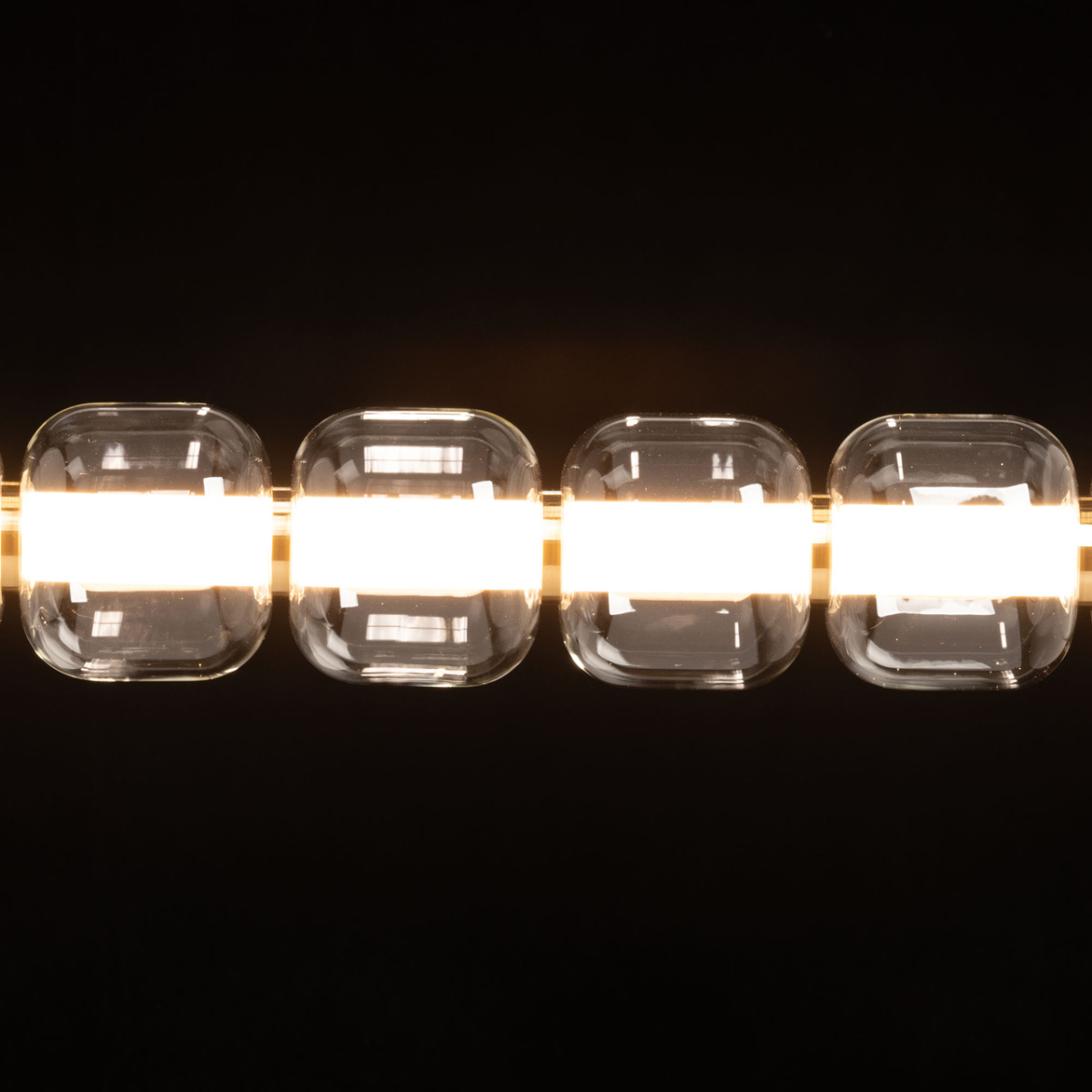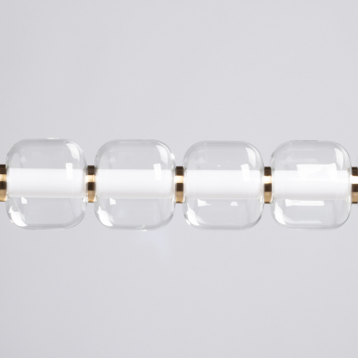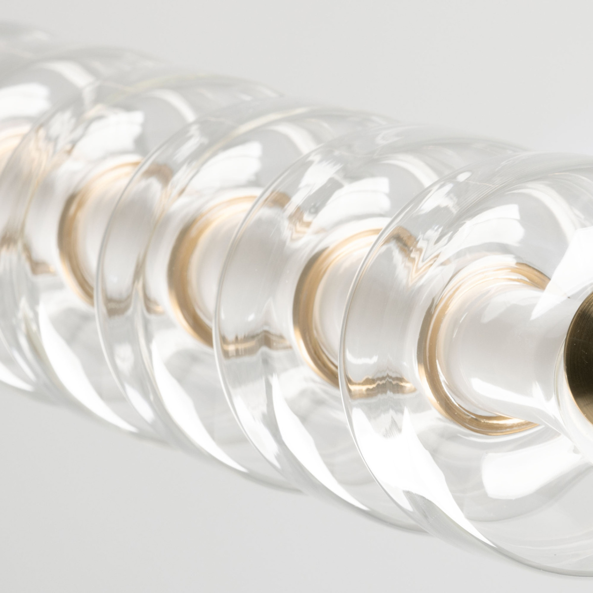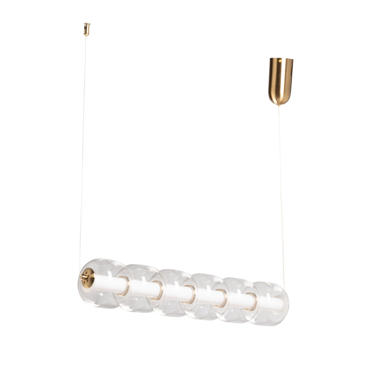 Металлическое основание гальванизировано в цвет медовой бронзы. Светодиодные источники света закрыты белым матовым акрилом. Светильник декорирован прозрачными стеклянными плафонами.