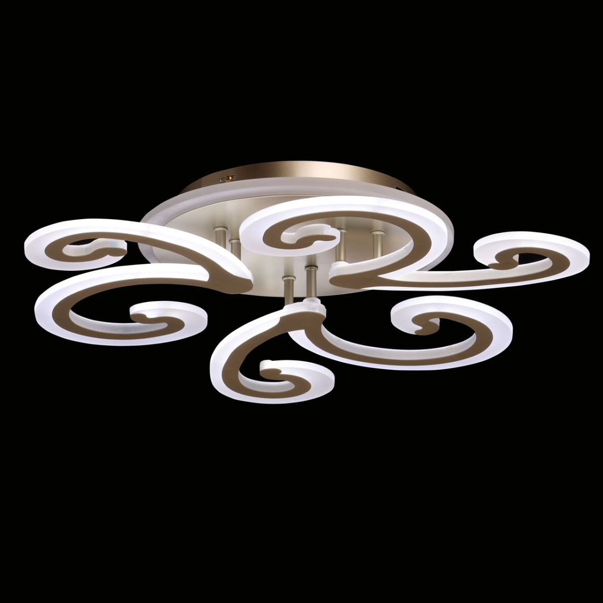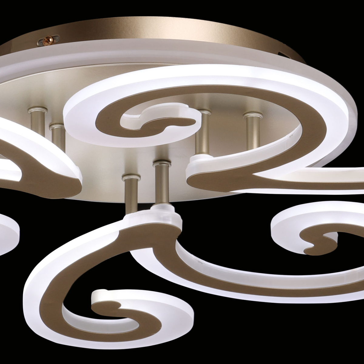 Металлическое основание потолочной люстры окрашено в цвет перламутрового золота. Корпус плафонов выполнен из сплава алюминия с цинком и окрашен в цвет основания. Светодиодные источники света закрыты белым матовым акрилом.