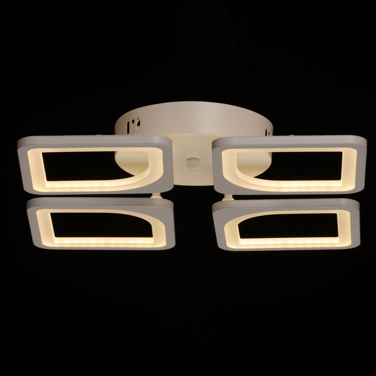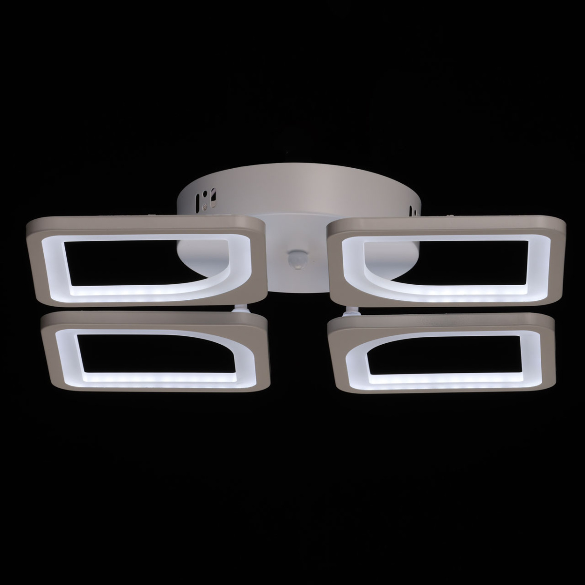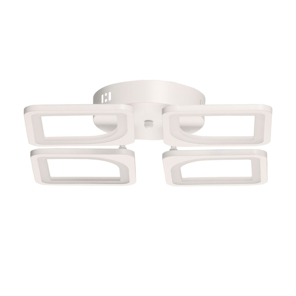 Металлическое основание потолочной люстры окрашено в белый цвет. Корпус плафона выполнен из сплава алюминия с цинком и окрашен в цвет основания. Светодиодные источники света закрыты белым матовым акрилом. Светильник приходит в состоянии частичной сборки в компактной упаковке: вся электрика подсоединена, достаточно закрепить плафоны на корпусе.