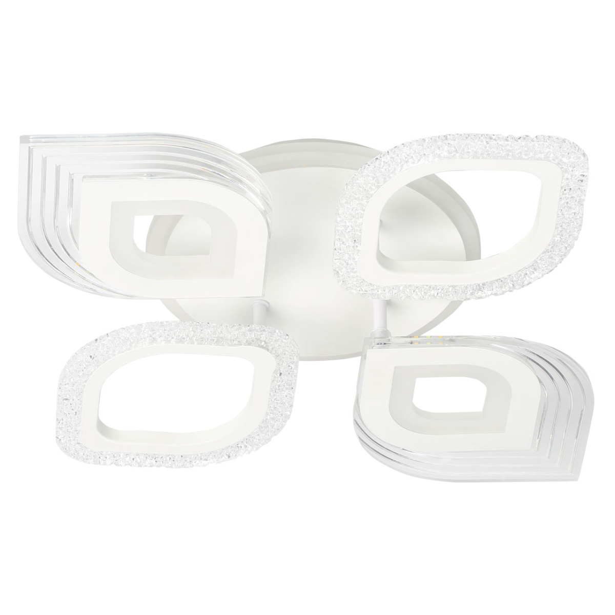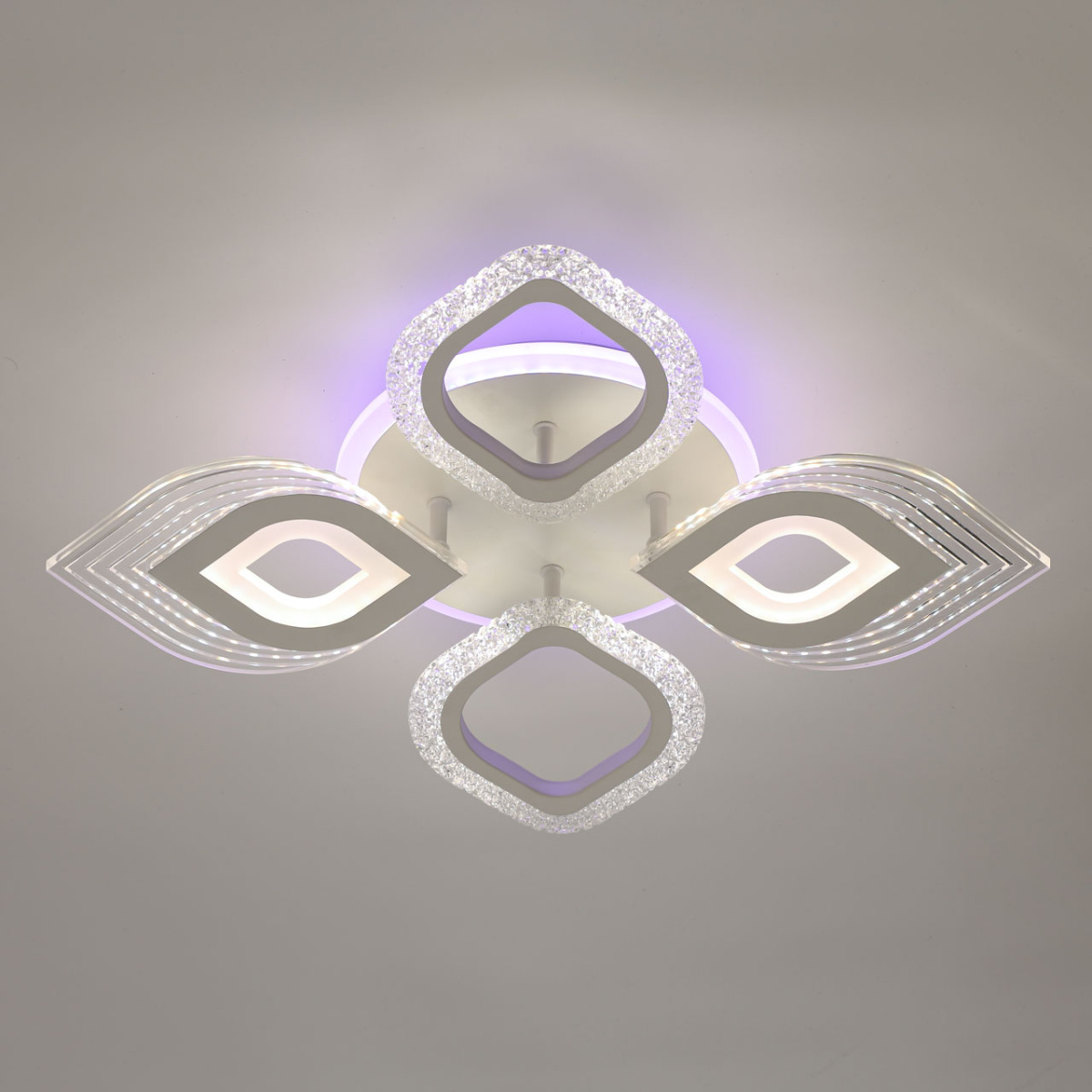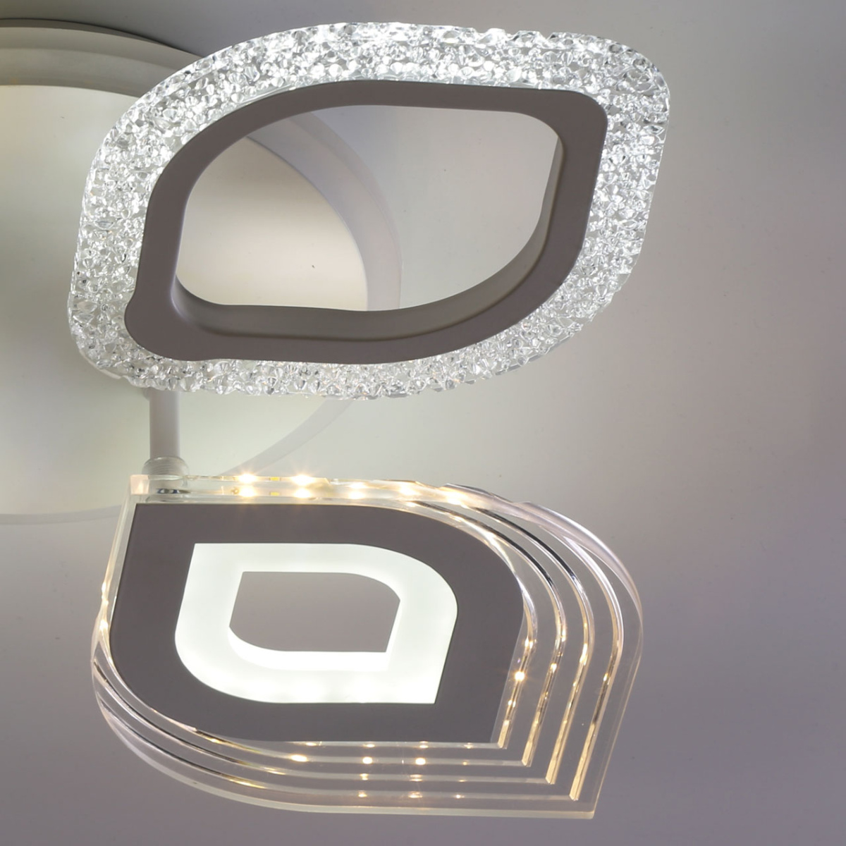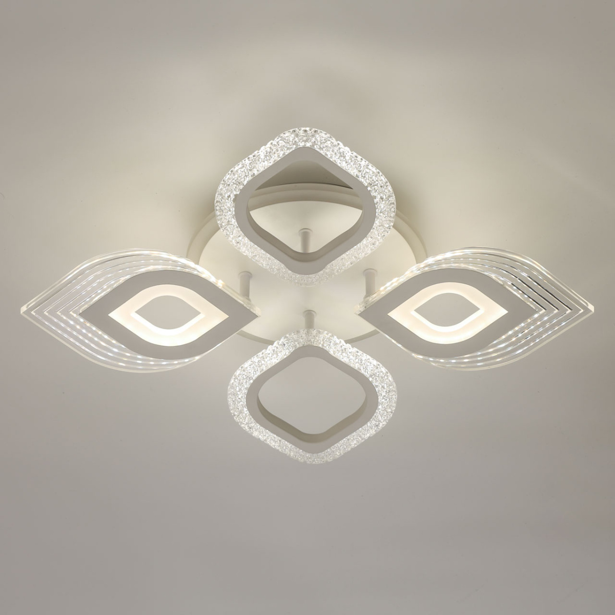 Металлическое основание светильника окрашено в белый цвет. Каркас плафона выполнен из сплава алюминия с цинком и окрашен в цвет основания. Светодиодные источники света закрыты белым матовым и прозрачным акрилом. Дополнительно, в светильнике предусмотрена подсветка потолочной чаши. Светильник приходит в состоянии частичной сборки в компактной упаковке: вся электрика подсоединена, достаточно закрепить плафоны на корпусе.