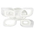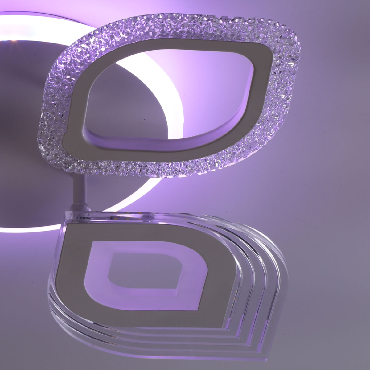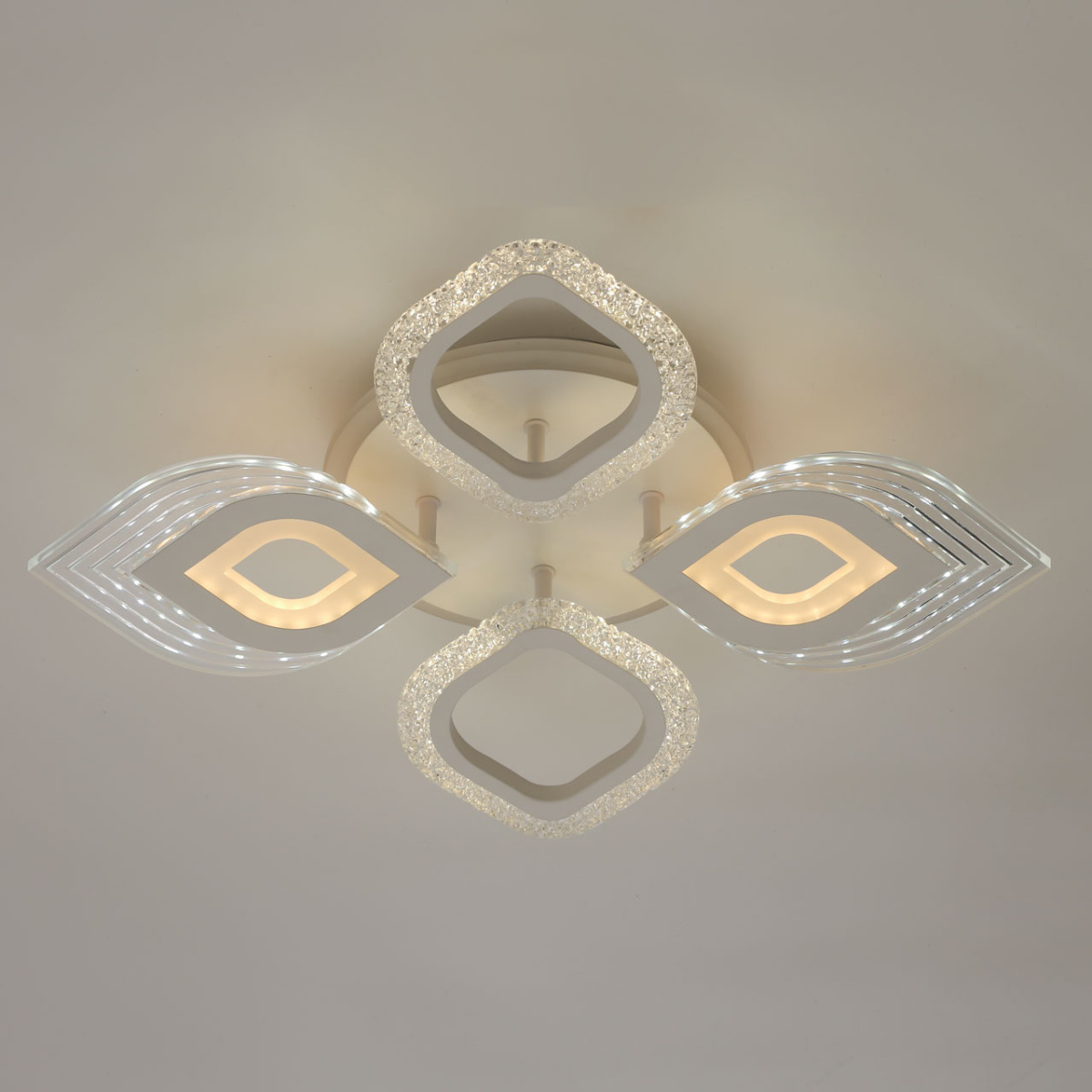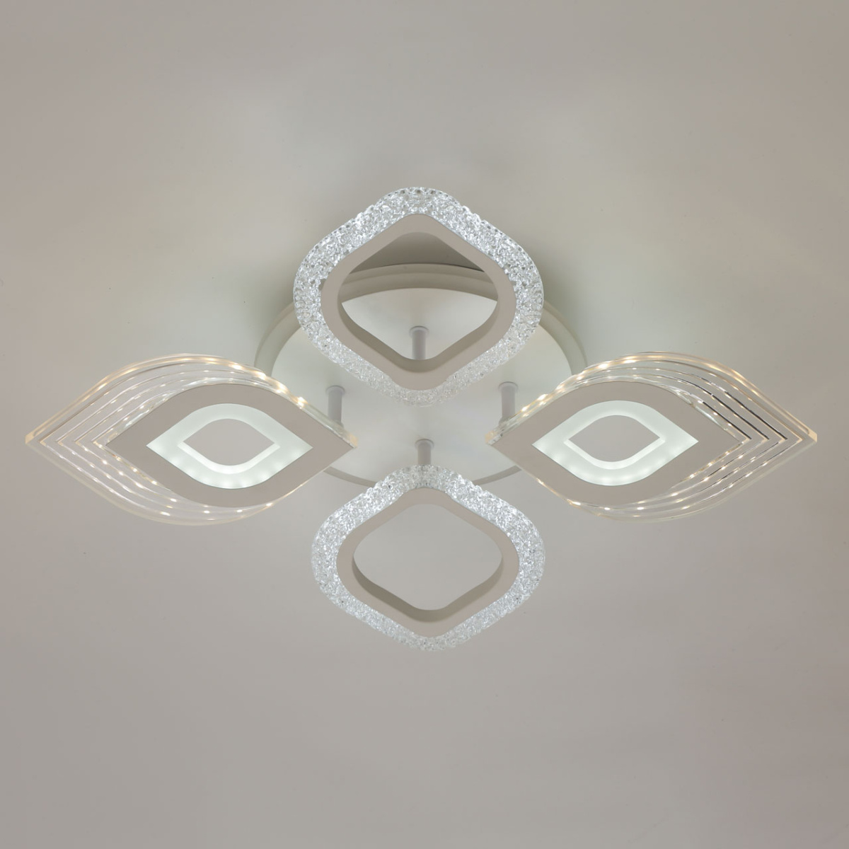 Металлическое основание светильника окрашено в белый цвет. Каркас плафона выполнен из сплава алюминия с цинком и окрашен в цвет основания. Светодиодные источники света закрыты белым матовым и прозрачным акрилом. Дополнительно, в светильнике предусмотрена подсветка потолочной чаши. Светильник приходит в состоянии частичной сборки в компактной упаковке: вся электрика подсоединена, достаточно закрепить плафоны на корпусе.