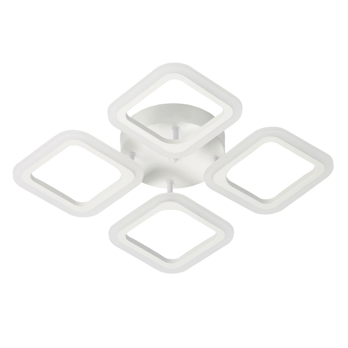 Металлическое основание и плафоны потолочной люстры окрашены в белый цвет. Светодиодные источники света закрыты белым матовым акрилом. Светильник приходит в состоянии частичной сборки в компактной упаковке: вся электрика подсоединена, достаточно закрепить плафоны на корпусе.
