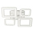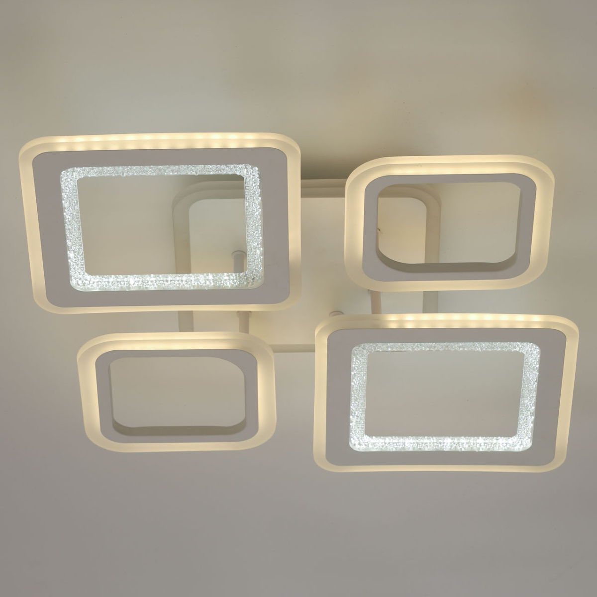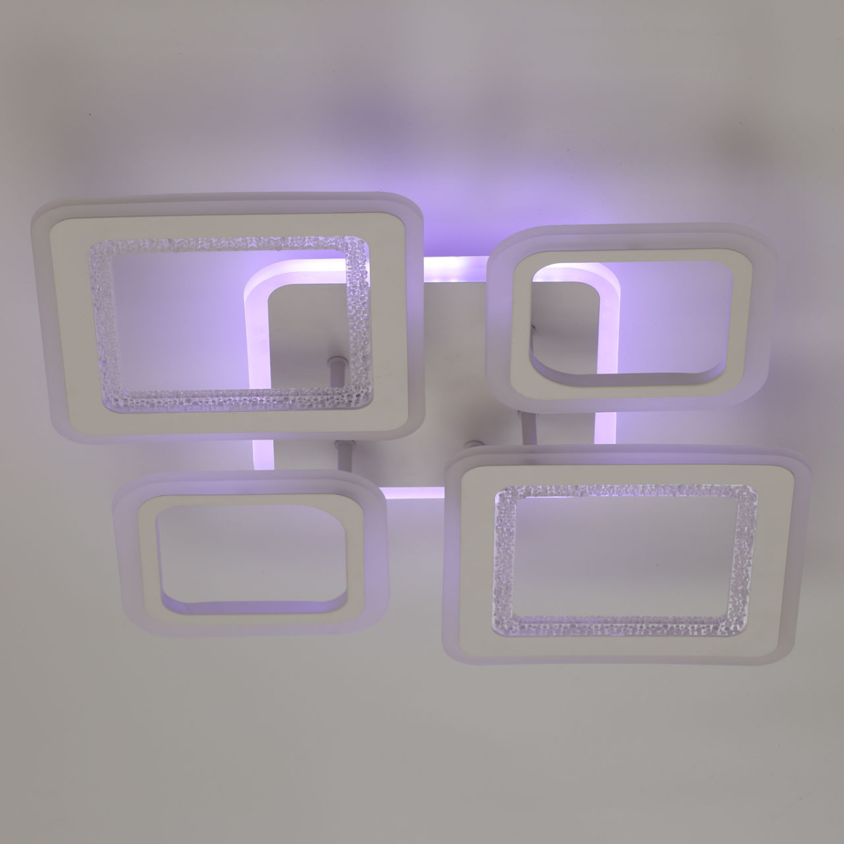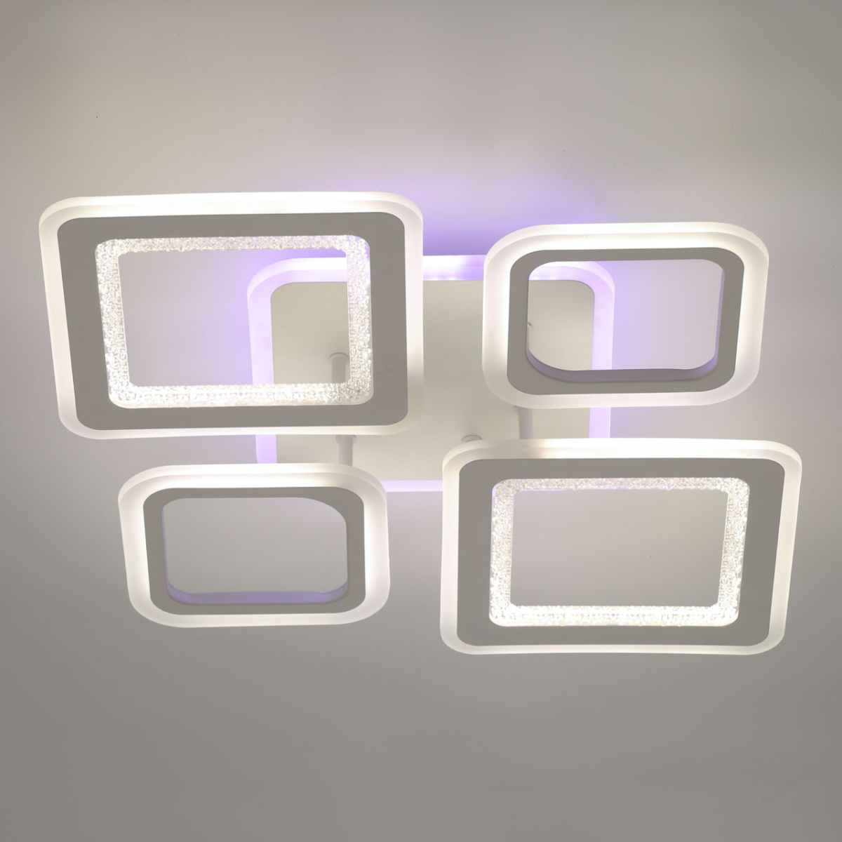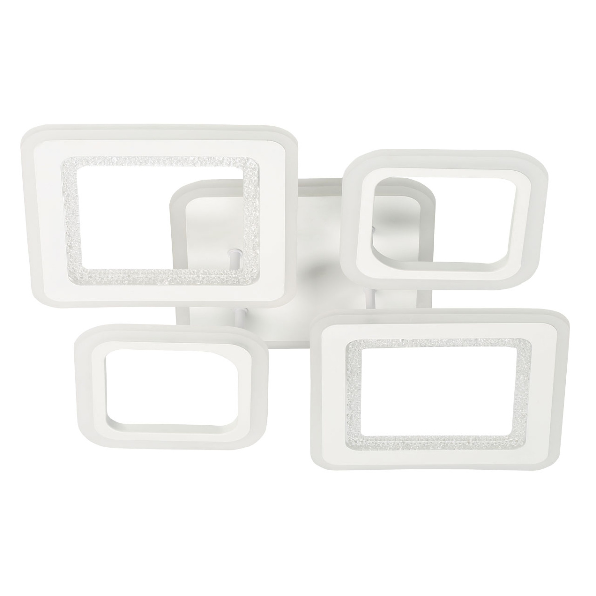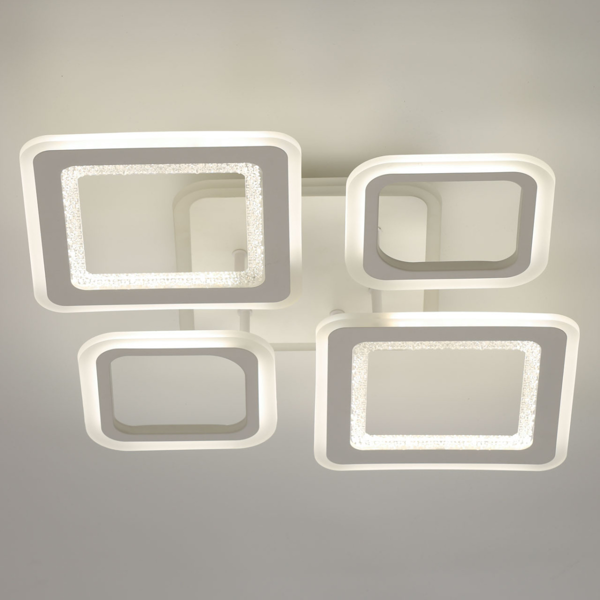 Металлическое основание светильника окрашено в белый цвет. Каркас плафона выполнен из сплава алюминия с цинком и окрашен в цвет основания. Светодиодные источники света закрыты белым матовым и фактурным прозрачным акрилом. Дополнительно, в светильнике предусмотрена подсветка потолочной чаши. Светильник приходит в состоянии частичной сборки в компактной упаковке: вся электрика подсоединена, достаточно закрепить плафоны на корпусе.