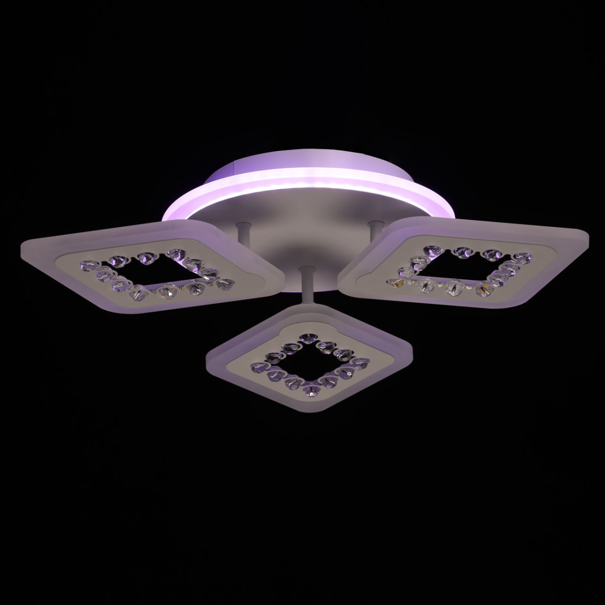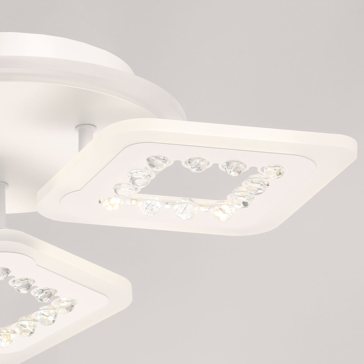 Металлическое основание потолочной люстры окрашено в белый цвет. Корпус плафона выполнен из сплава алюминия с цинком и окрашен в цвет основания. Светодиодные источники света закрыты белым матовым акрилом. Плафоны декорированы бусинами из прозрачного акрила. Дополнительно, в светильнике предусмотрена подсветка потолочной чаши. Светильник приходит в состоянии частичной сборки в компактной упаковке: вся электрика подсоединена, достаточно закрепить плафоны на корпусе.