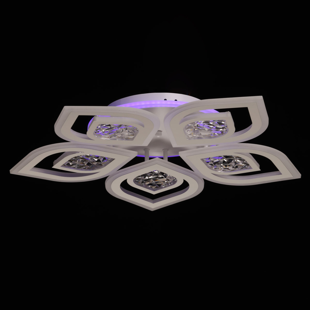 Металлическое основание потолочной люстры окрашено в белый цвет. Корпус плафона выполнен из сплава алюминия с цинком и окрашен в цвет основания. Светодиодные источники света закрыты белым матовым и прозрачным фактурным акрилом. Светильник приходит в состоянии частичной сборки в компактной упаковке: вся электрика подсоединена, достаточно закрепить плафоны на корпусе.