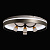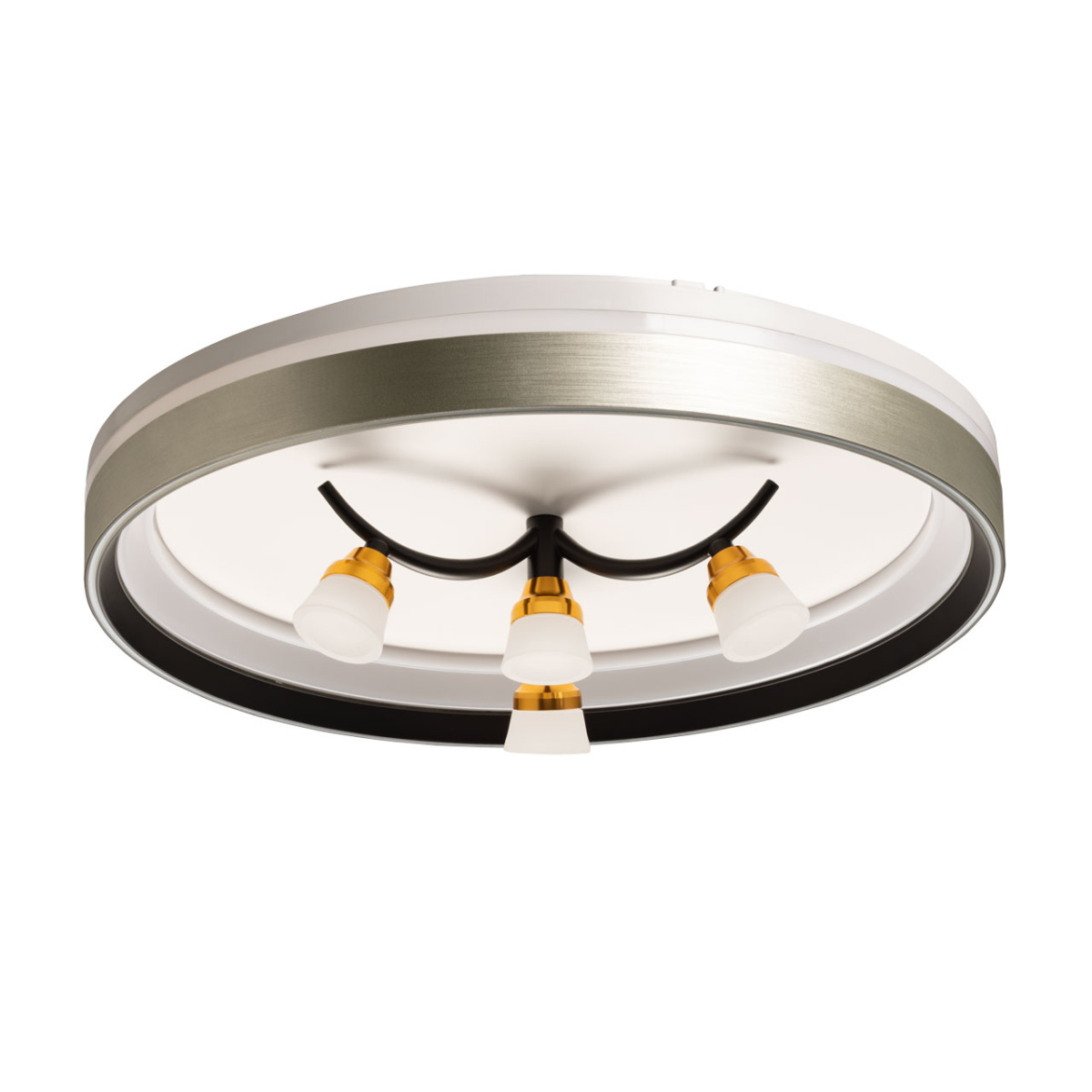 Металлическое основание потолочной люстры окрашено в белый цвет. Корпус плафона выполнен из сплава алюминия и окрашен с наружи в серый цвет, с внутренней стороны в черный цвет. Светодиодные источники света закрыты белым матовым акрилом. Рожки окрашены в черный цвет, держатели ламп гальванизированы в цвет золота.
