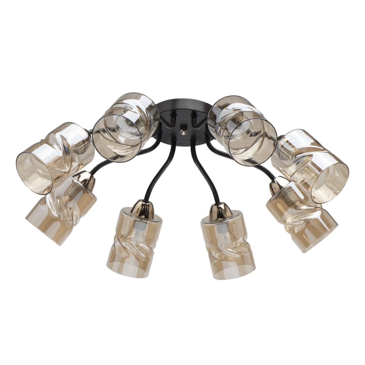 Металлическое основание светильника окрашено в черный цвет. Отдельные элементы основания гальванизированы в золотой цвет. Стеклянные плафоны отлиты в сложную перекрученную форму и гальванизированы в цвет шампань.