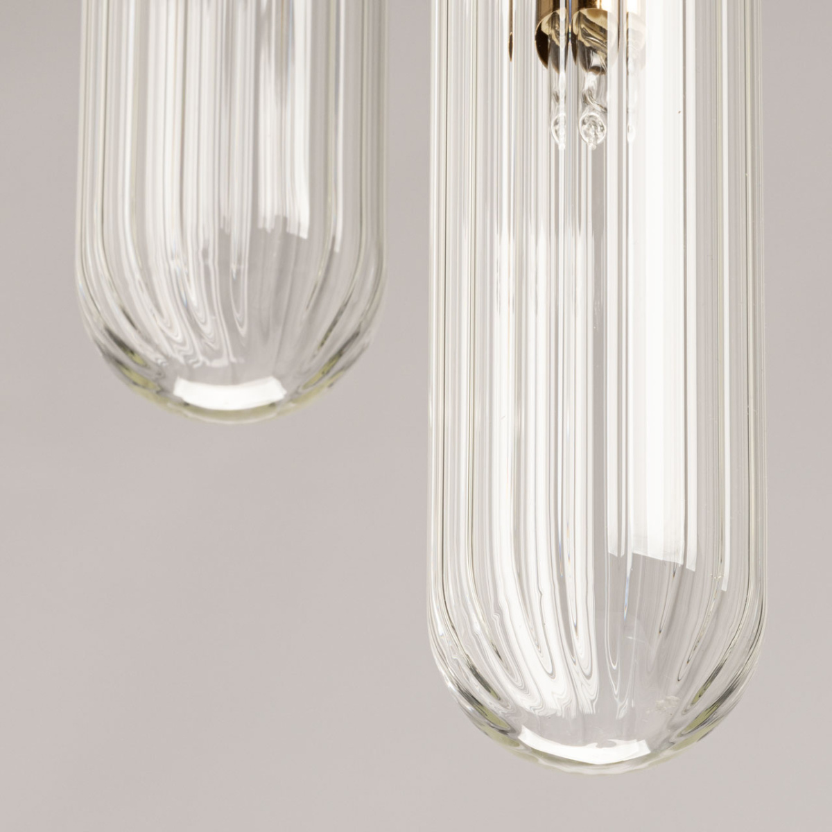 Металлическое основание люстры гальванизировано в цвет медовой бронзы. Подвесной светильник декорирован плафонами оригинальной формы из прозрачного стекла, отлитого в сложную форму.