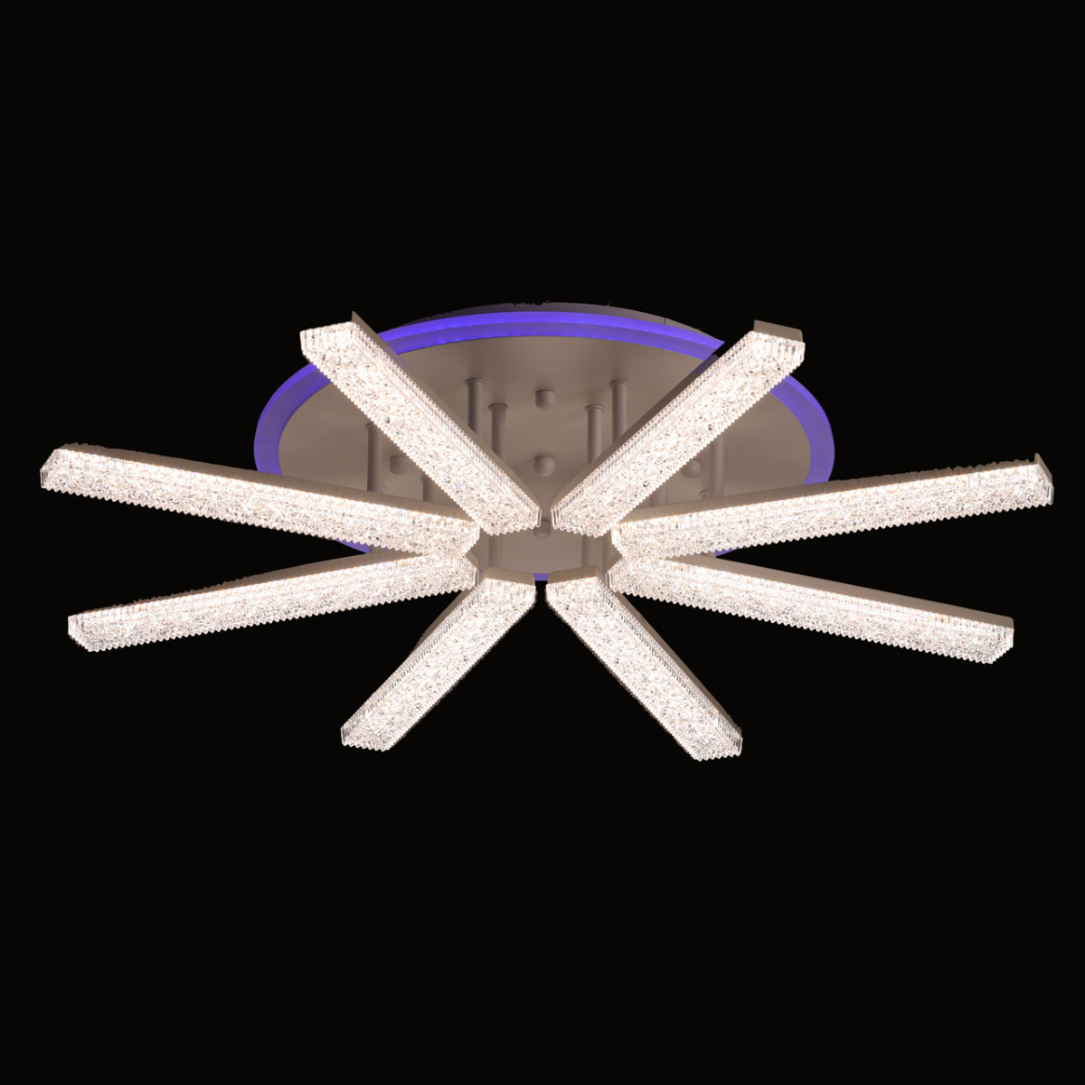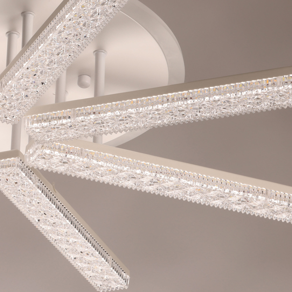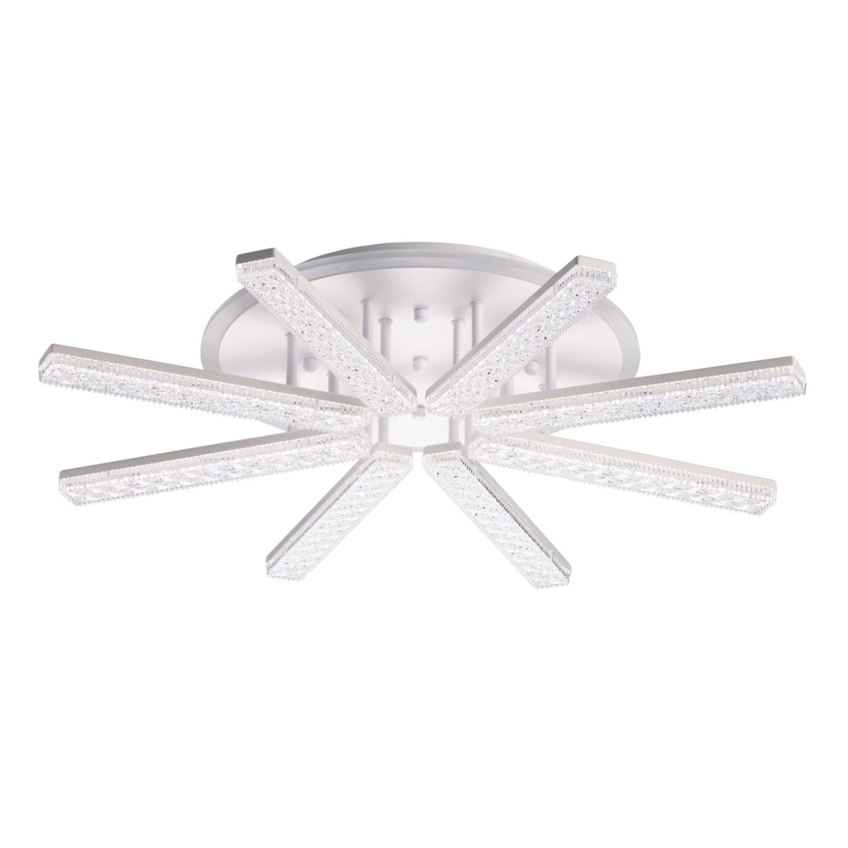 Металлическое основание потолочной люстры окрашено в белый цвет. Светодиодные источники света у потолочной чаши закрыты белым матовым акрилом, на рожках - прозрачным фактурным акрилом.