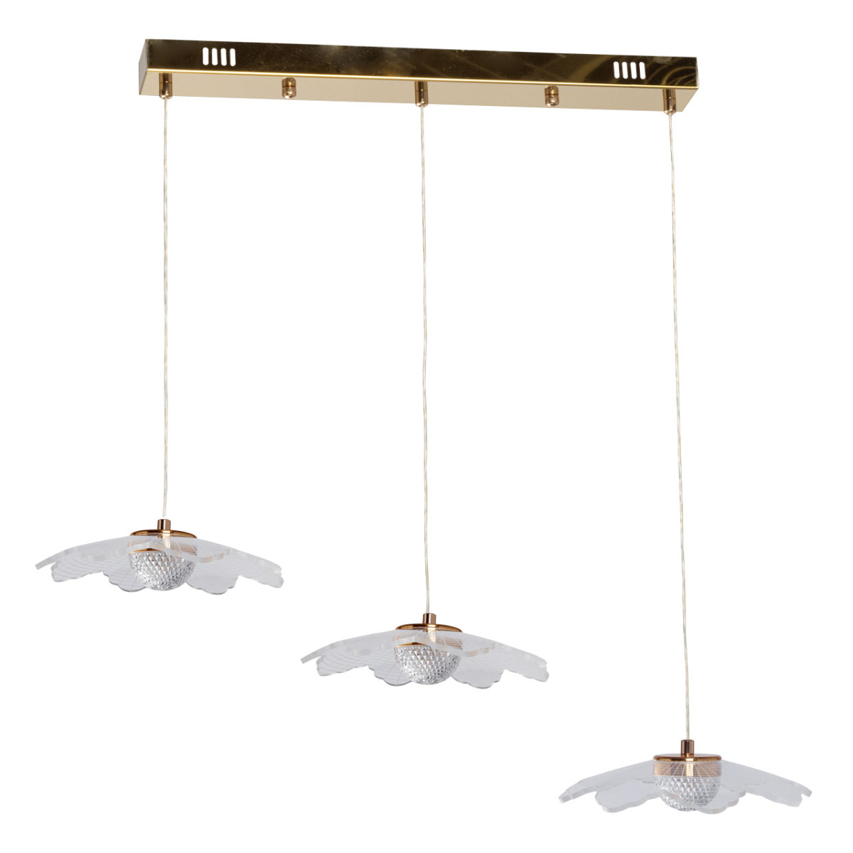 Металлическое основание светильника гальванизировано в цвет золота. Корпус плафона выполнен из сплава алюминия с цинком. Плафоны выполнены из прозрачного акрила.