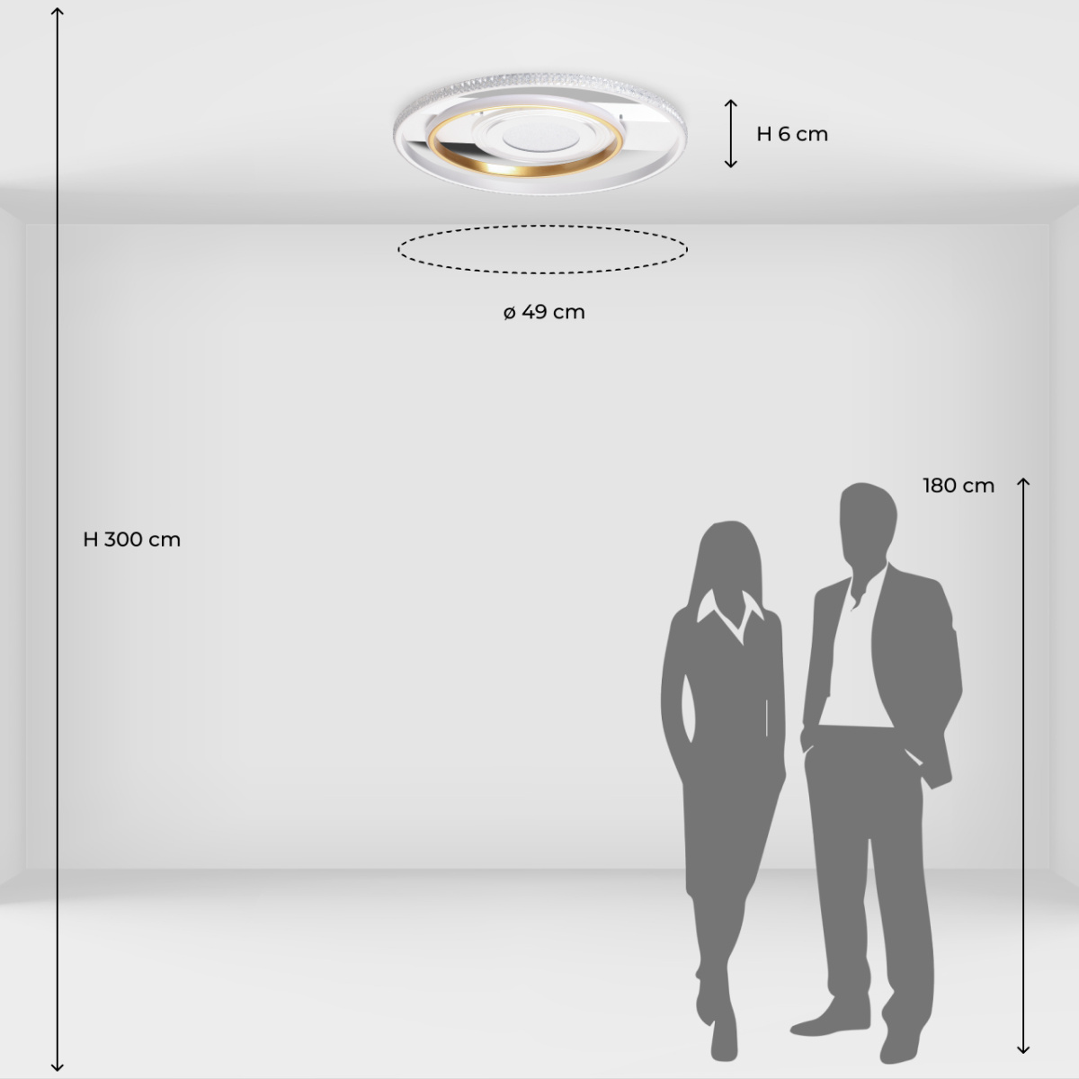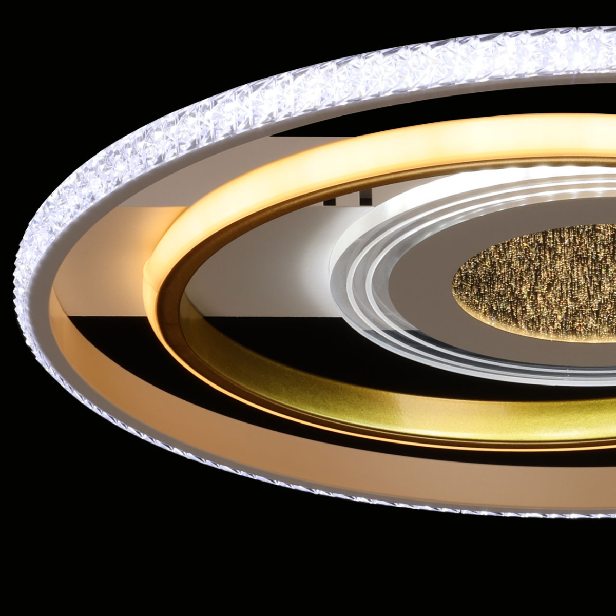 Металлическое основание потолочной люстры окрашено в белый цвет. Корпус плафонов выполнен из сплава алюминия с цинком и окрашен в золотой и белый цвета. Светодиодные источники света закрыты прозрачным и белым матовым акрилом. В центре потолочная люстра декорирована прозрачным акрилом круглой формы и акрилом в виде хрустальной россыпи.