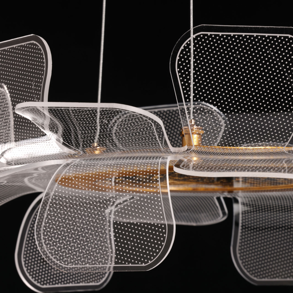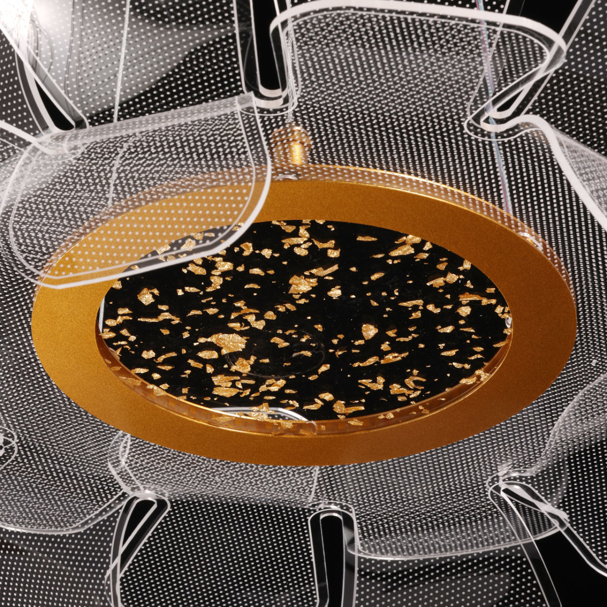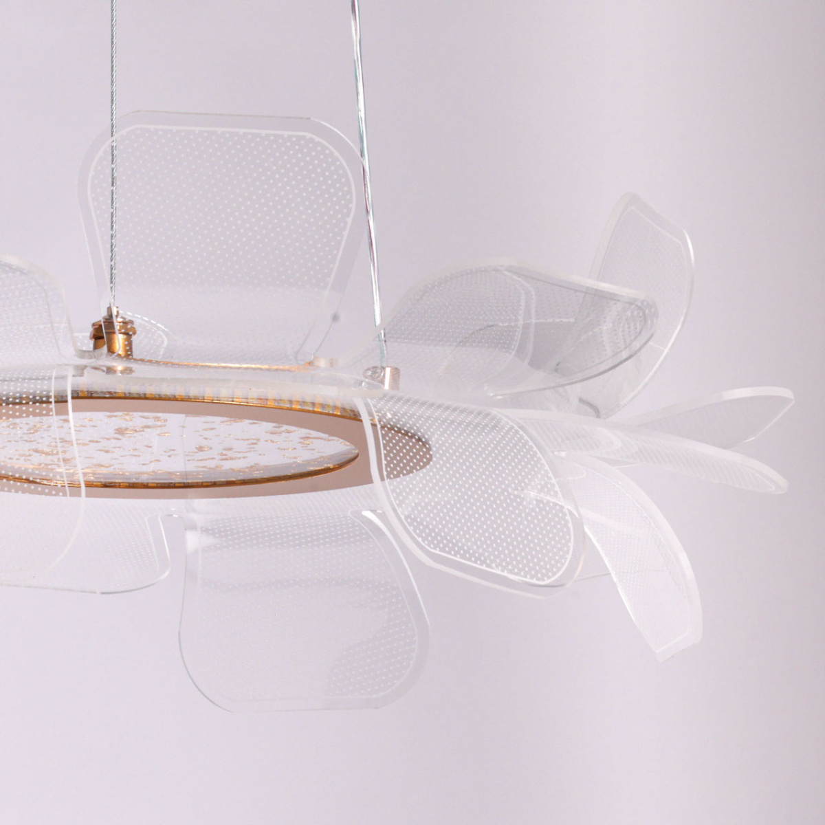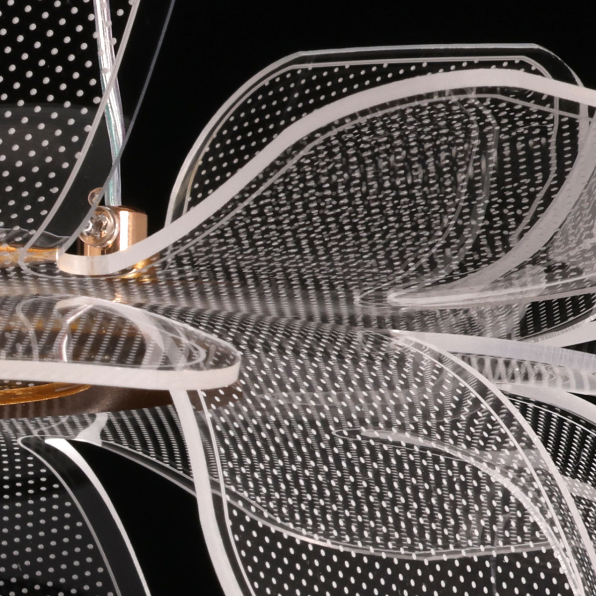 Металлическое основание светильника гальванизировано в цвет золота. Корпус плафона выполнен из сплава алюминия с цинком. Плафон выполнены из прозрачного акрила.