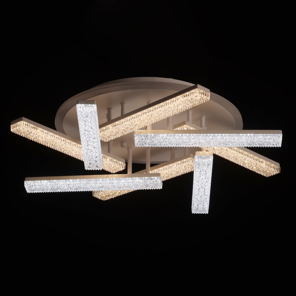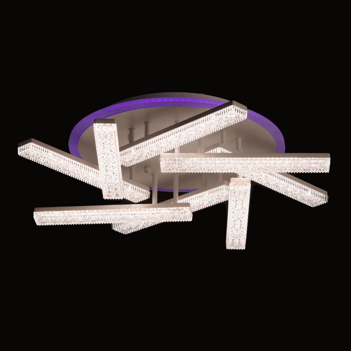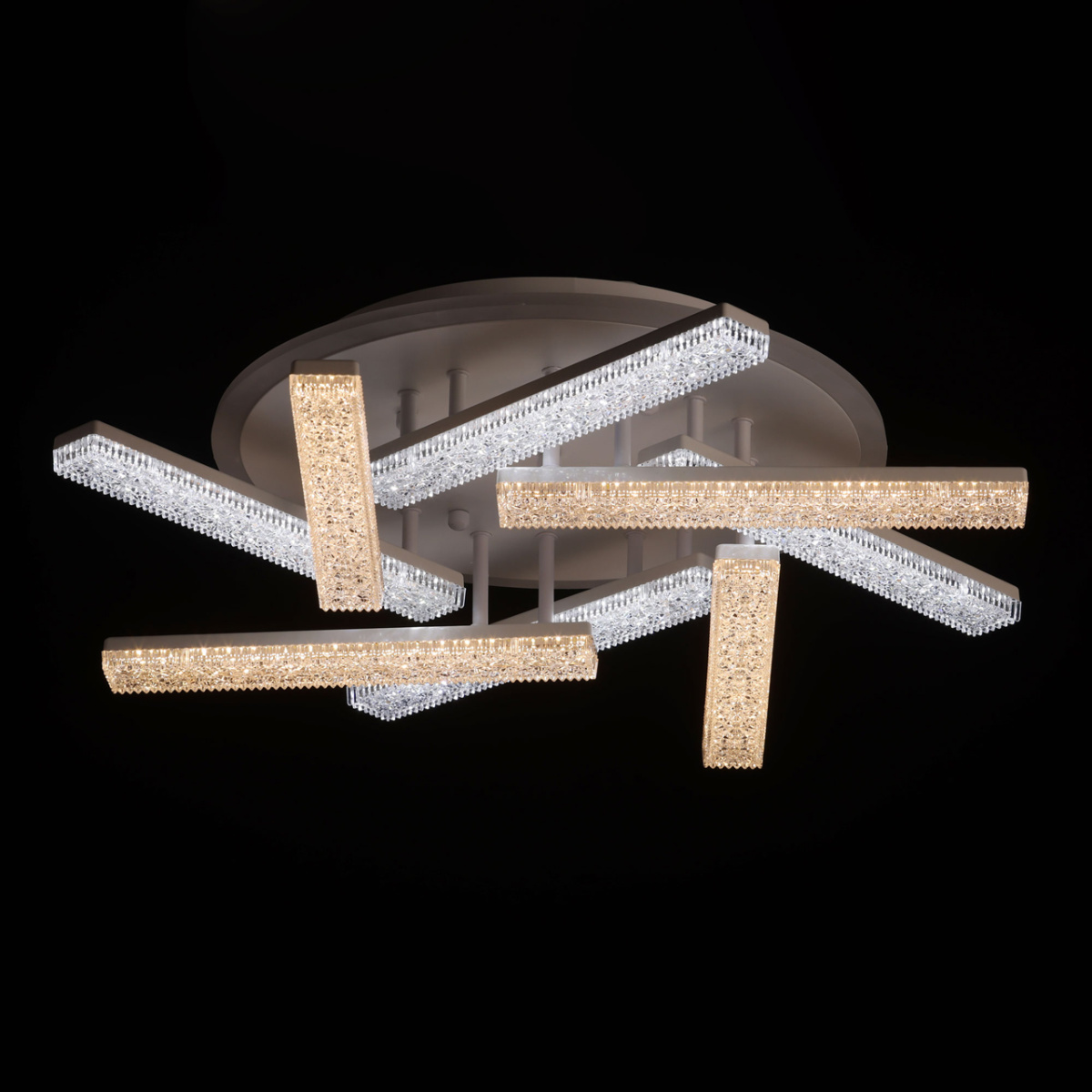 Металлическое основание потолочной люстры окрашено в белый цвет. Светодиодные источники света у потолочной чаши закрыты белым матовым акрилом, на рожках - прозрачным фактурным акрилом.