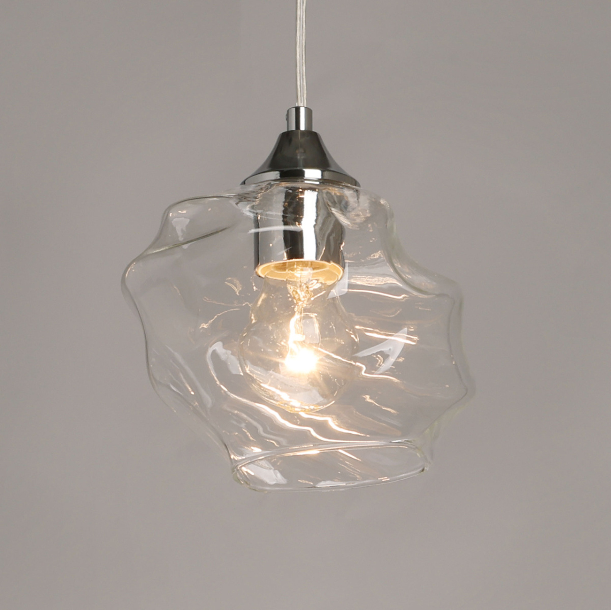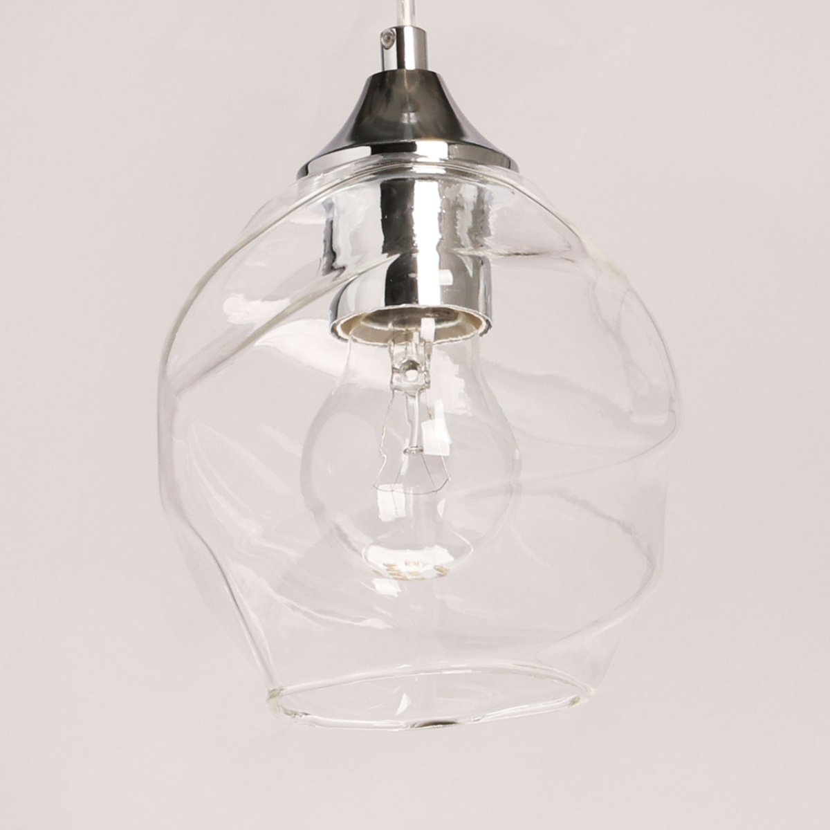 Металлическое основание подвеса гальванизировано в цвет хрома. Плафон отлит из прозрачного стекла оригинальной формы.