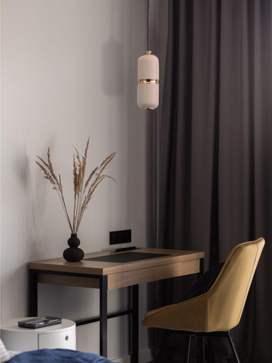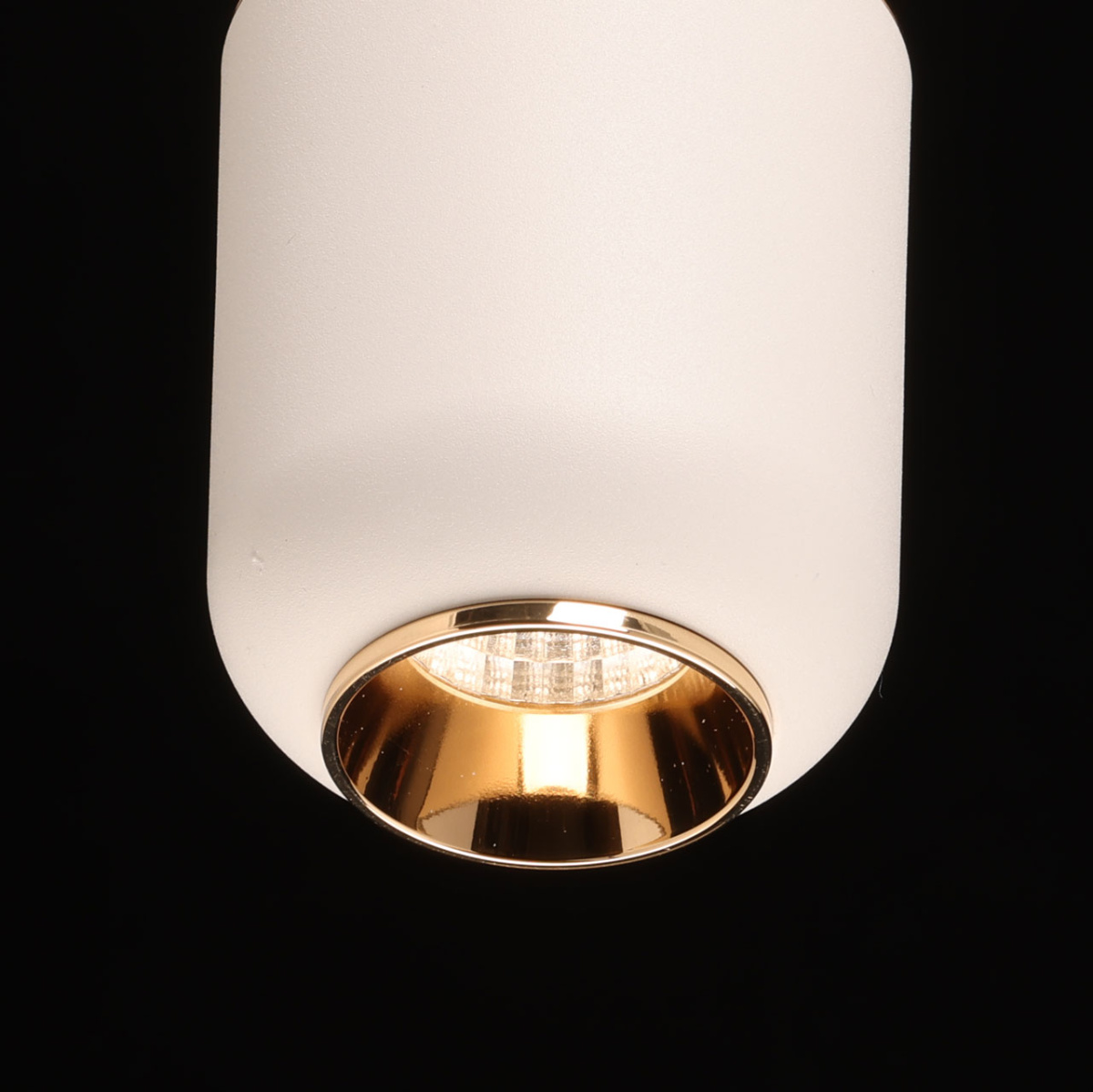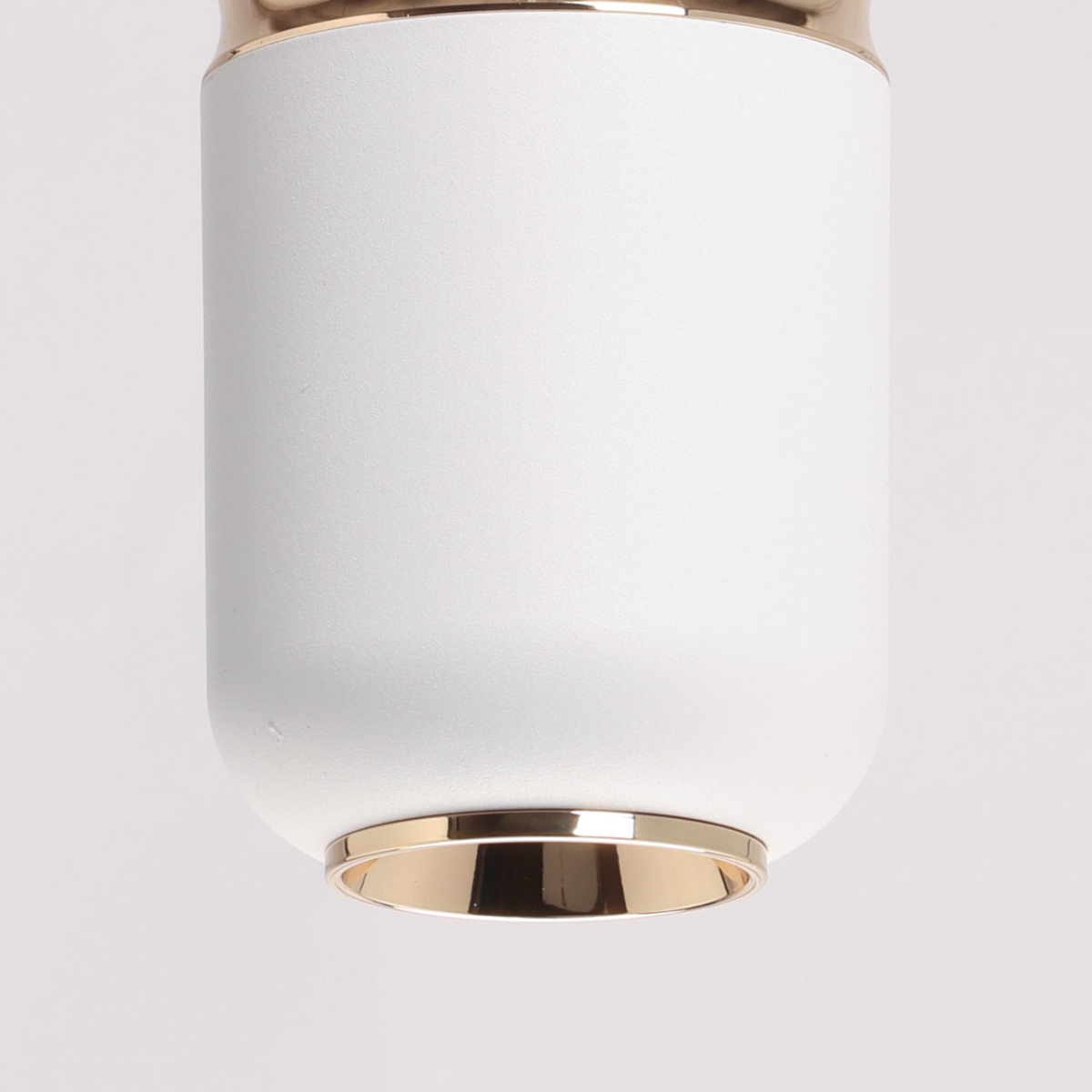 Металлическое основание подвеса окрашено в черный цвет. Корпус плафона выполнен из сплава алюминия и окрашен в белый цвет. Отдельные элементы плафона гальванизированы в цвет золота.